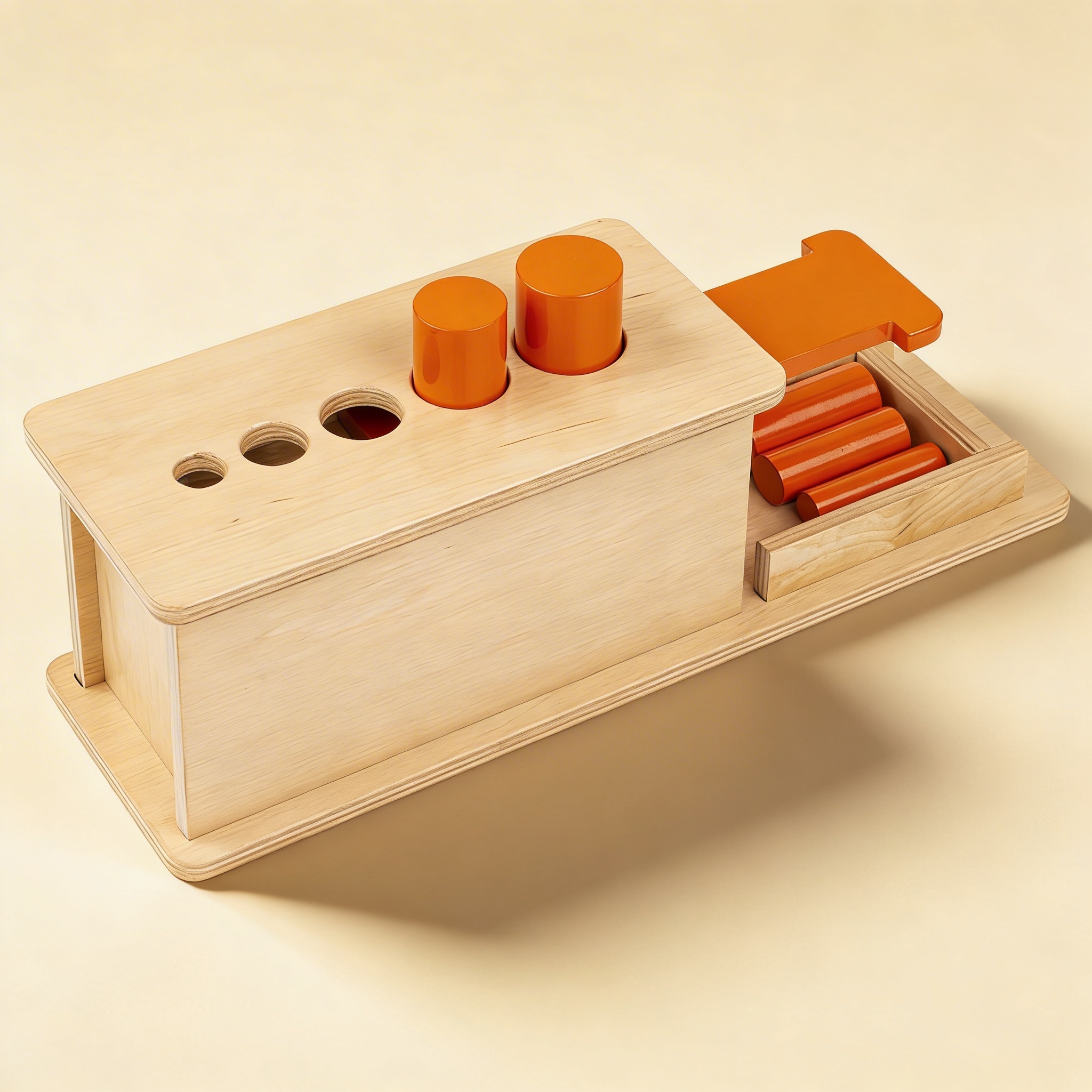 Children begin by sliding open the drawer to access the cylinders, then attempt to match each cylinder to its corresponding hole on top. The sliding action adds complexity to the traditional exercise, requiring careful handling and control. Children develop systematic thinking as they explore which cylinder fits where through experimentation.