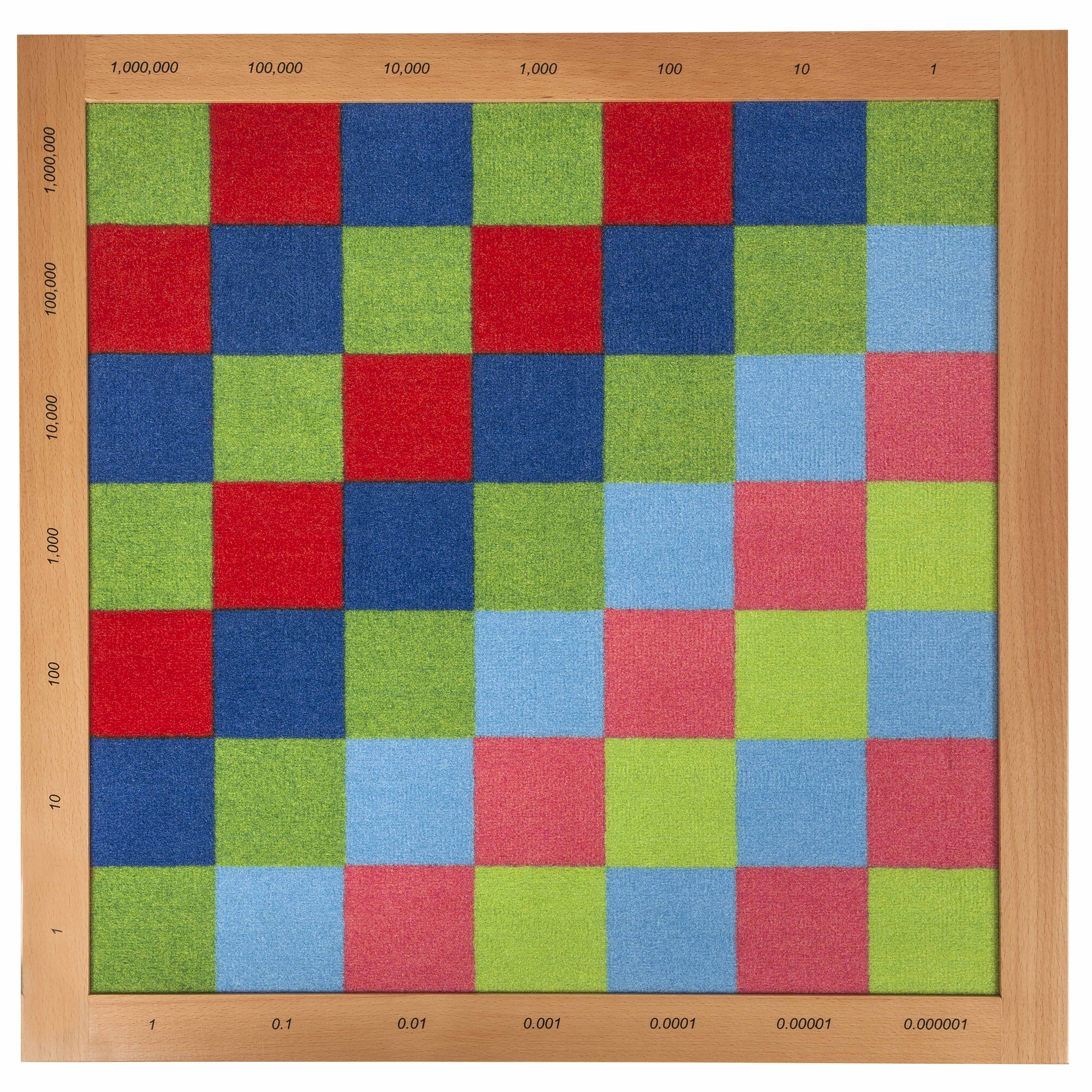 The Decimal Checker Board transforms the invisible architecture of our number system into a tangible, color-coded landscape where children physically move numbered tiles across logarithmic progressions. Each fabric square on the 7×7 grid represents a power of ten, creating a visual hierarchy from units to millions that children navigate with their hands. The Decimal Checker Board addresses the developmental need for concrete experience with abstract mathematical relationships, particularly the challenge of understanding how multiplication creates exponential growth across place values. Through positioning tiles on specific colored squares, children discover that multiplying by ten means moving one square to the left, making the base-ten system a physical journey rather than a mental abstraction. This material exists because children at this stage need to see and manipulate the mathematical patterns that govern large-number operations before they can internalize these concepts.