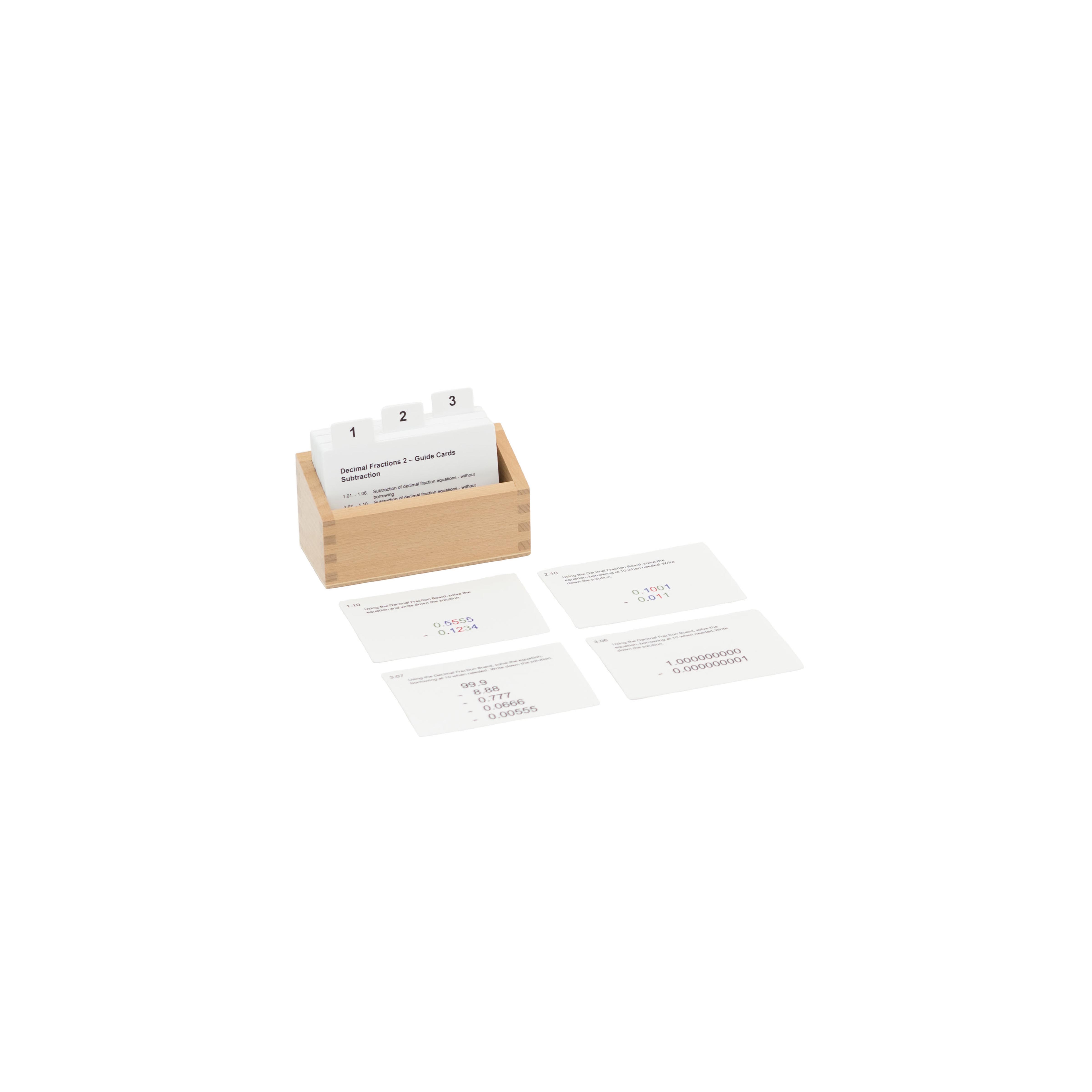 While the exercise cards can be used independently, they work best in conjunction with Montessori decimal fraction materials such as decimal fraction boards, cubes, and squares. These concrete materials help children physically manipulate quantities before working with the more abstract card exercises.