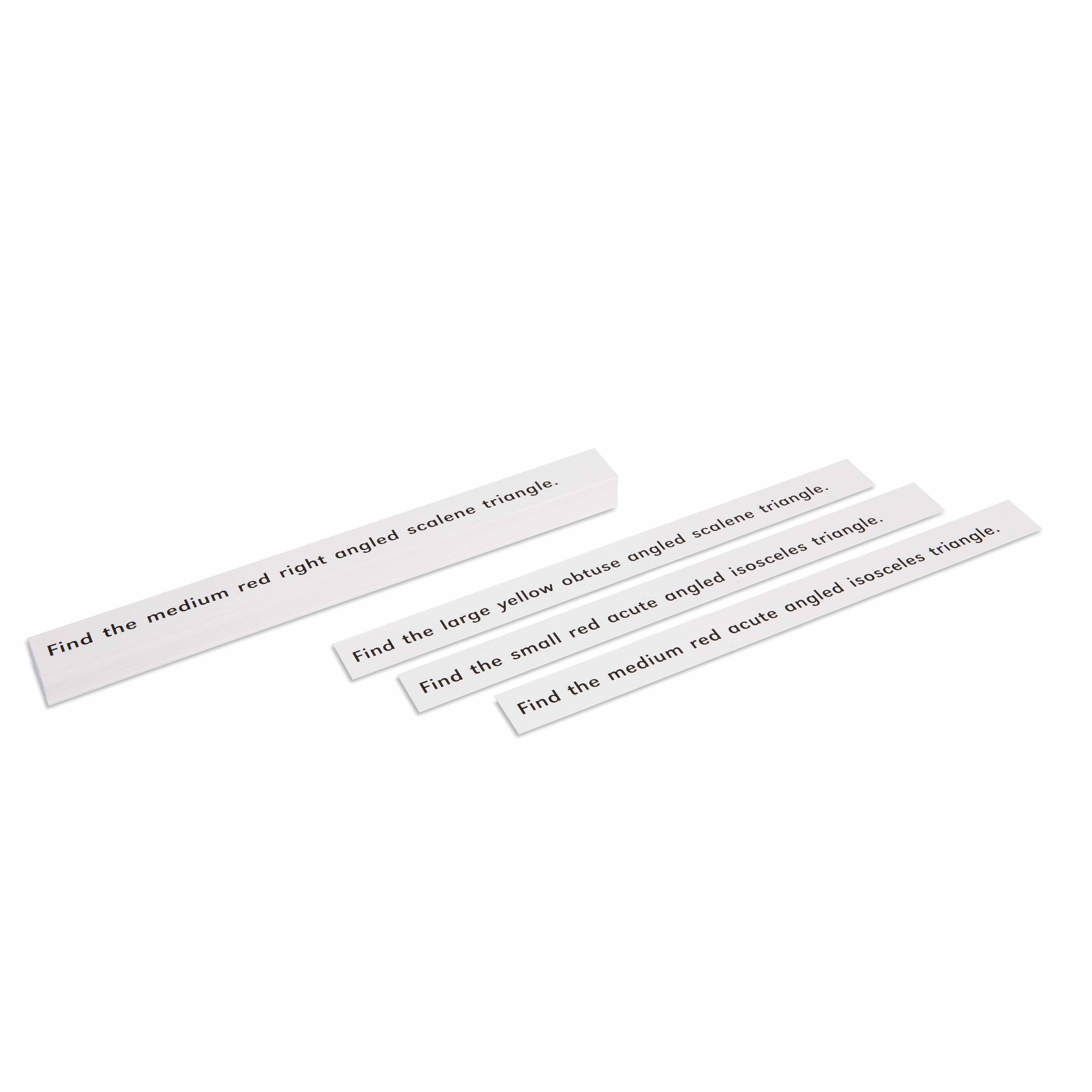 Detective Adjective Exercise Commands are laminated strips containing sentences that children read and act out, focusing on identifying and responding to adjectives. For example, a command might read 'Touch the red pencil' or 'Walk to the tall shelf,' requiring children to recognize the descriptive word and perform the corresponding action.