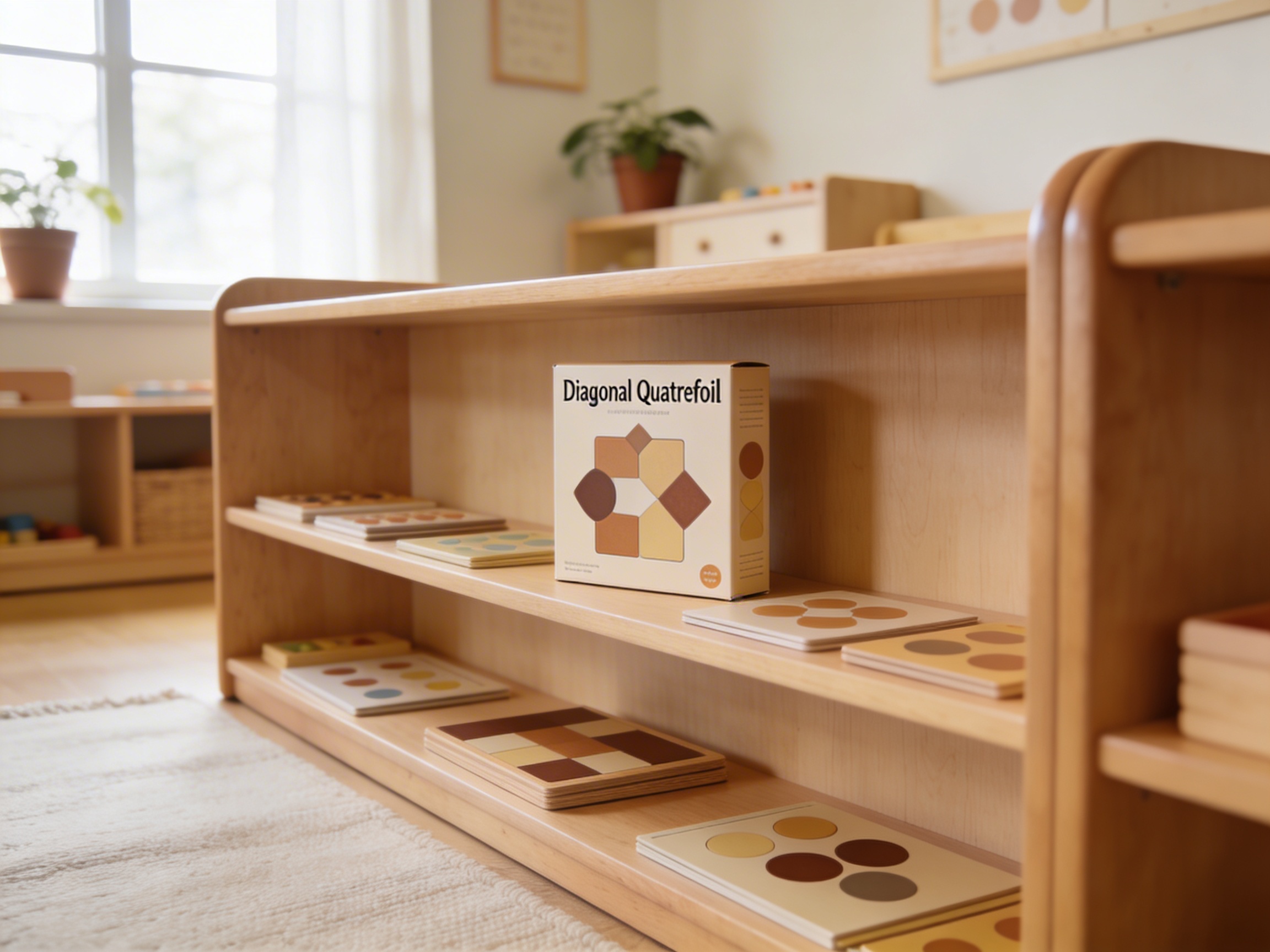 The Diagonal Quatrefoil builds upon earlier shape puzzles and prepares children for advanced geometry work. It bridges sensorial exploration with abstract mathematical concepts, connecting to lessons on polygons, circles, and complex shapes in the geometry curriculum.