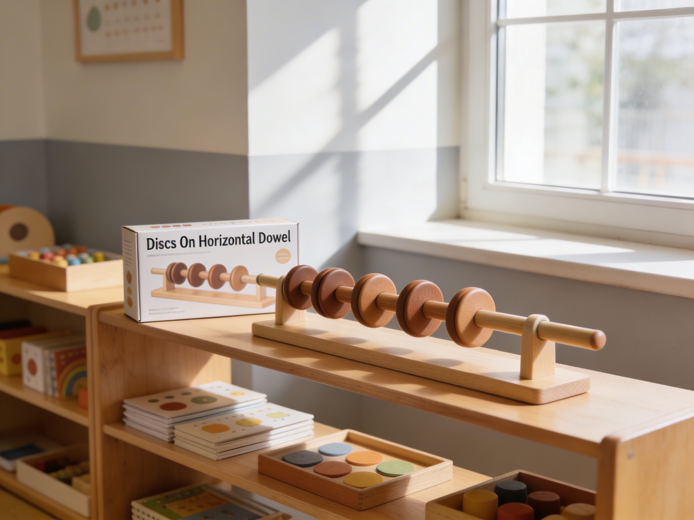 The Discs On Horizontal Dowel is a Educational Materials Montessori material designed for children aged 0-3, crafted by Nienhuis Montessori to AMI standards.