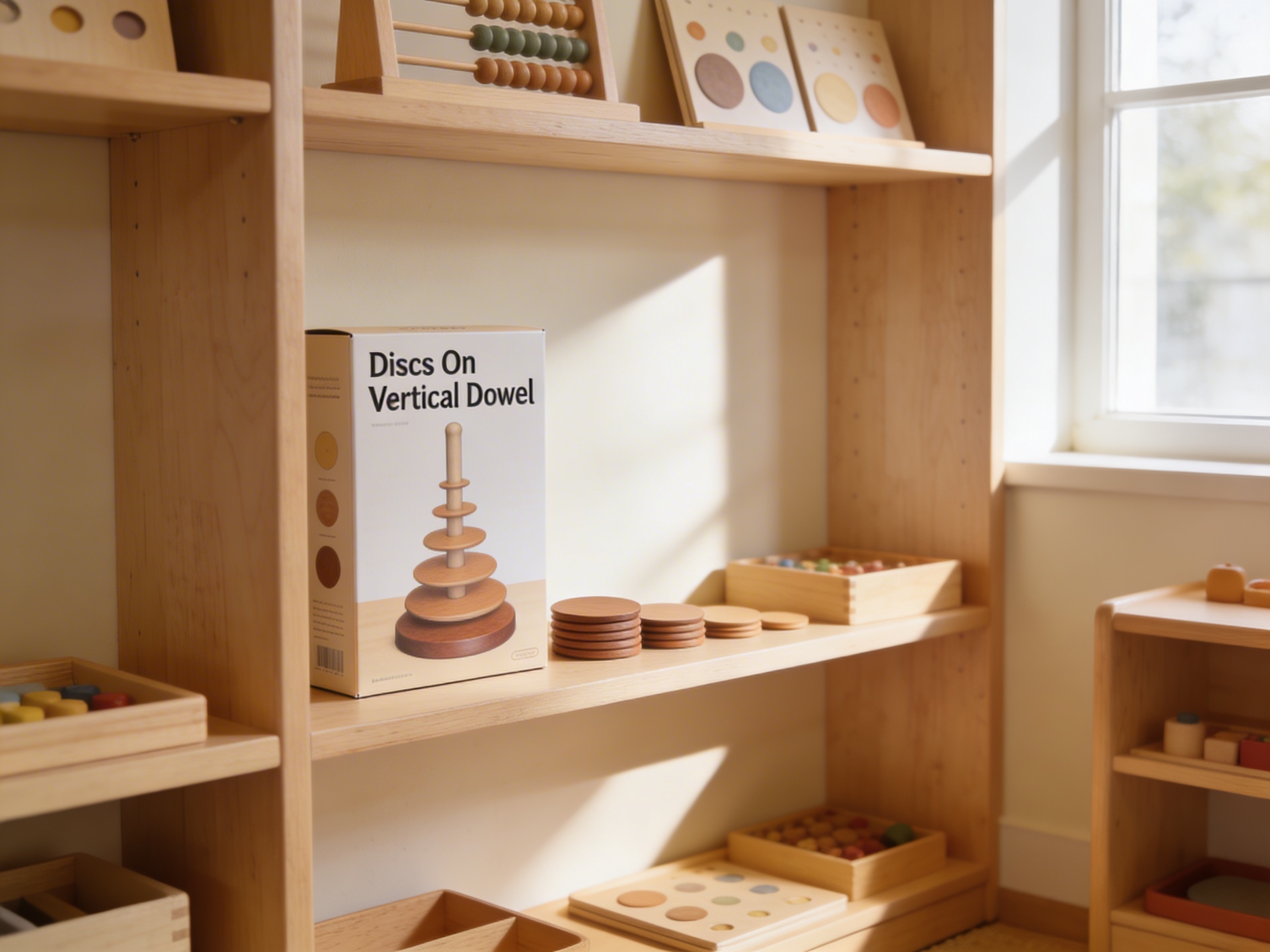 The Discs On Vertical Dowel is a Educational Materials Montessori material designed for children aged 0-3, crafted by Nienhuis Montessori to AMI standards.
