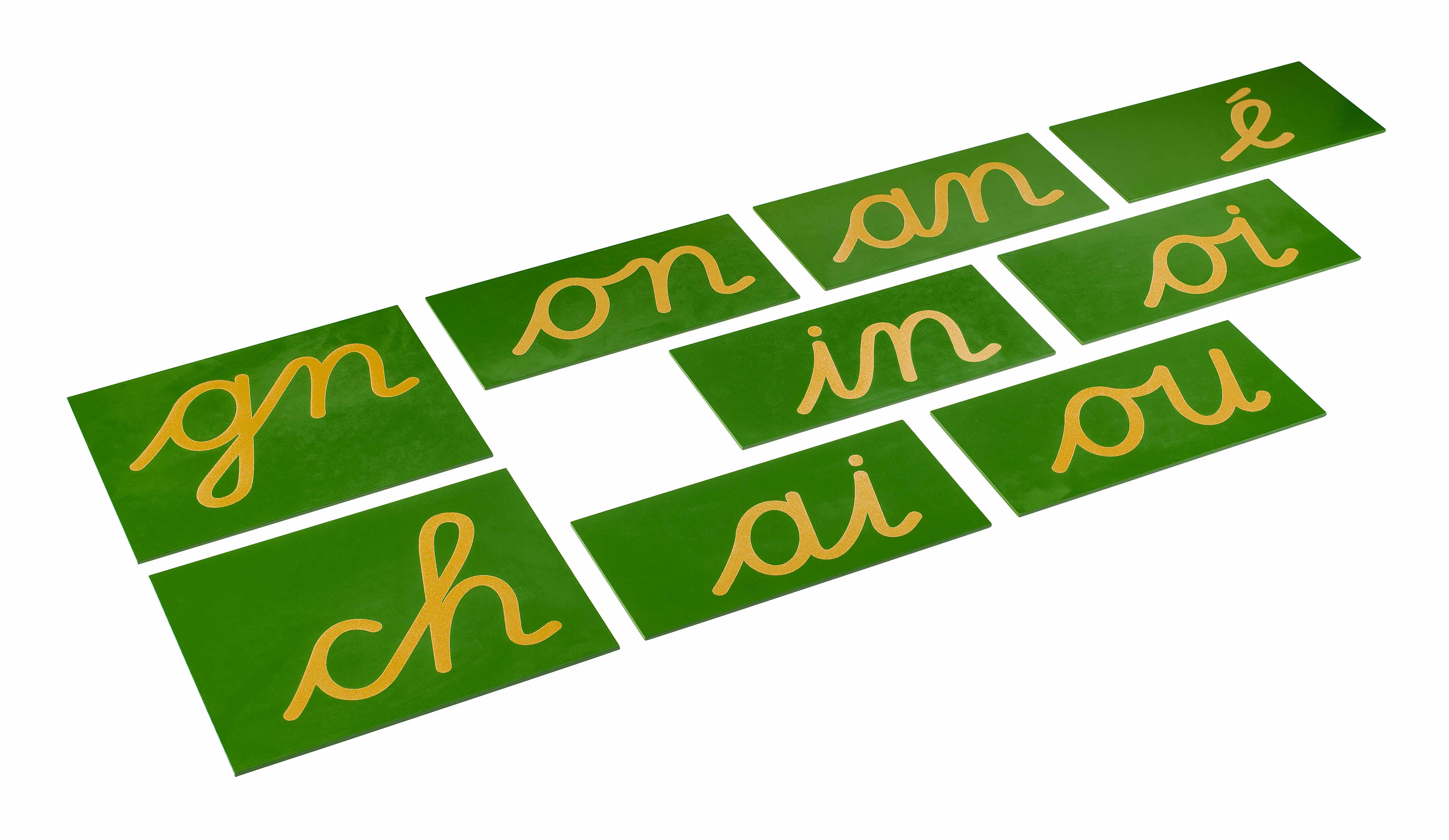 The Double Sandpaper Letters for French Cursive address the specific need for children to internalize digraphs and letter combinations unique to French literacy. Each sandpaper card's tactile surface engages multiple senses simultaneously—the rough texture guides finger movement while the contrasting green background isolates the cursive forms visually. This multisensory approach of the Double Sandpaper Letters recognizes that French cursive requires fluid, connected movements that differ significantly from print letters. The sandpaper's resistance provides immediate feedback when tracing, helping children develop the precise muscle memory needed for French cursive writing. By presenting digraphs like 'ou', 'ch', and 'an' as unified sandpaper formations, these cards help children perceive these letter combinations as single phonetic units rather than separate letters. The Double Sandpaper Letters bridge the gap between recognizing individual letters and understanding how French combines letters to create distinct sounds, preparing children for both reading and writing French text with its characteristic cursive flow.