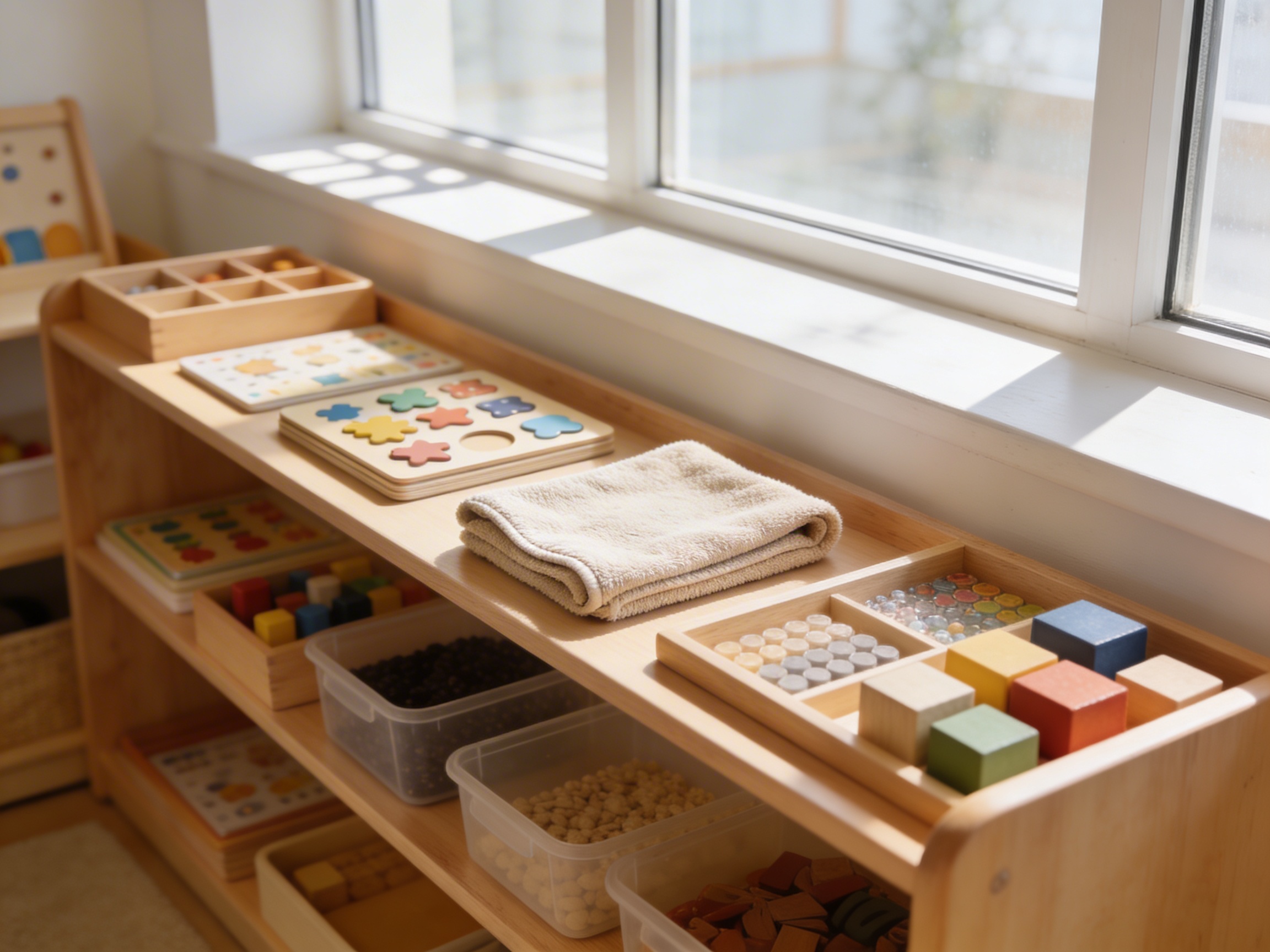 This cloth develops fine motor skills, hand-eye coordination, and concentration. Through practical life activities like dusting and polishing, children strengthen their pincer grip, learn sequential movements, and develop a sense of order and responsibility for their environment.