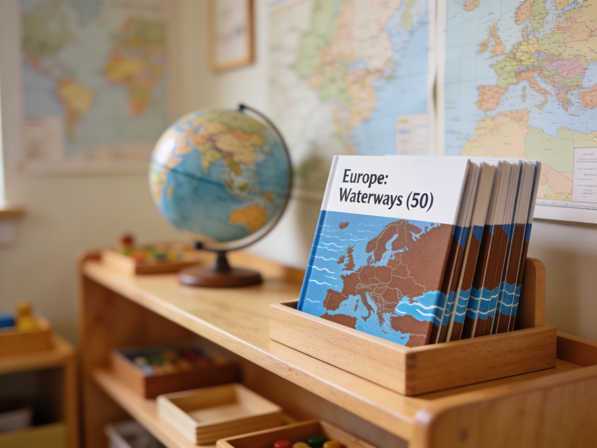 This map aligns with Montessori's concrete-to-abstract approach, providing a clear visual foundation for understanding water systems. It encourages independent exploration, sensorial learning, and helps children understand the interconnectedness of European geography through waterways.