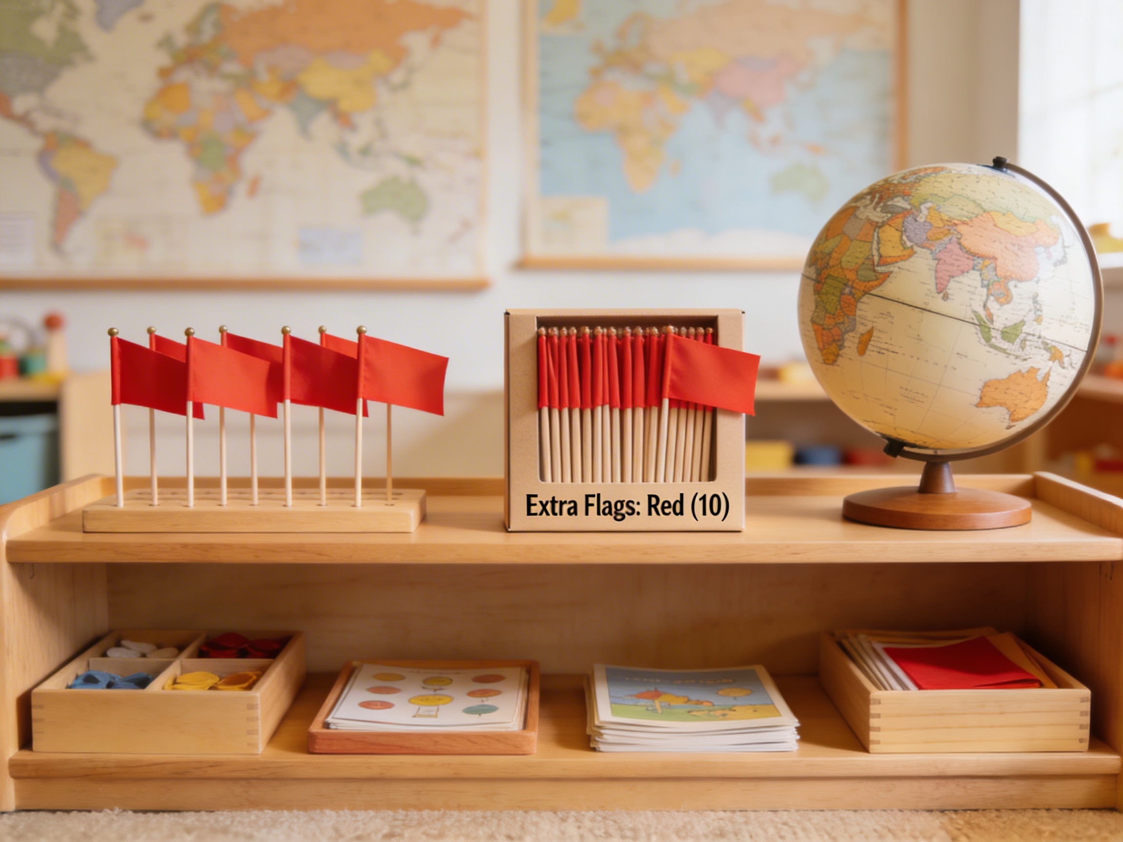 The uniform red color allows for consistent marking during specific activities. Many Montessori classrooms use color-coding systems where red flags might represent capitals, countries of study, or other designated categories.