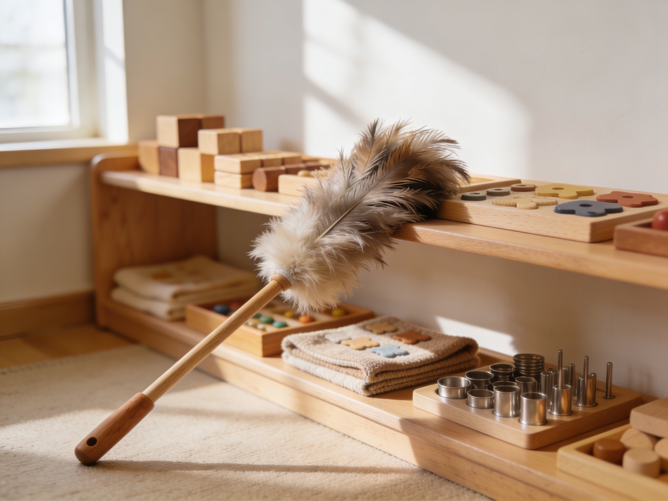 The feather duster serves as a bridge between the child's innate desire to imitate adult work and their developing capacity for purposeful movement. In Montessori environments for children ages 0-3, the soft ostrich feathers provide immediate visual feedback as dust disappears, satisfying the young child's need to see the direct results of their efforts. The feather duster's lightweight design and ergonomic handle accommodate the toddler's still-developing grip strength and coordination. Unlike abstract activities, dusting with real feathers connects the child to meaningful household work, fostering a sense of belonging within their community. The hanging ring on the feather duster establishes a consistent storage location, reinforcing the Montessori principle that every tool has its proper place. Through wielding the feather duster, children experience the satisfaction of contributing to their environment's beauty and order, building both competence and confidence in their abilities.