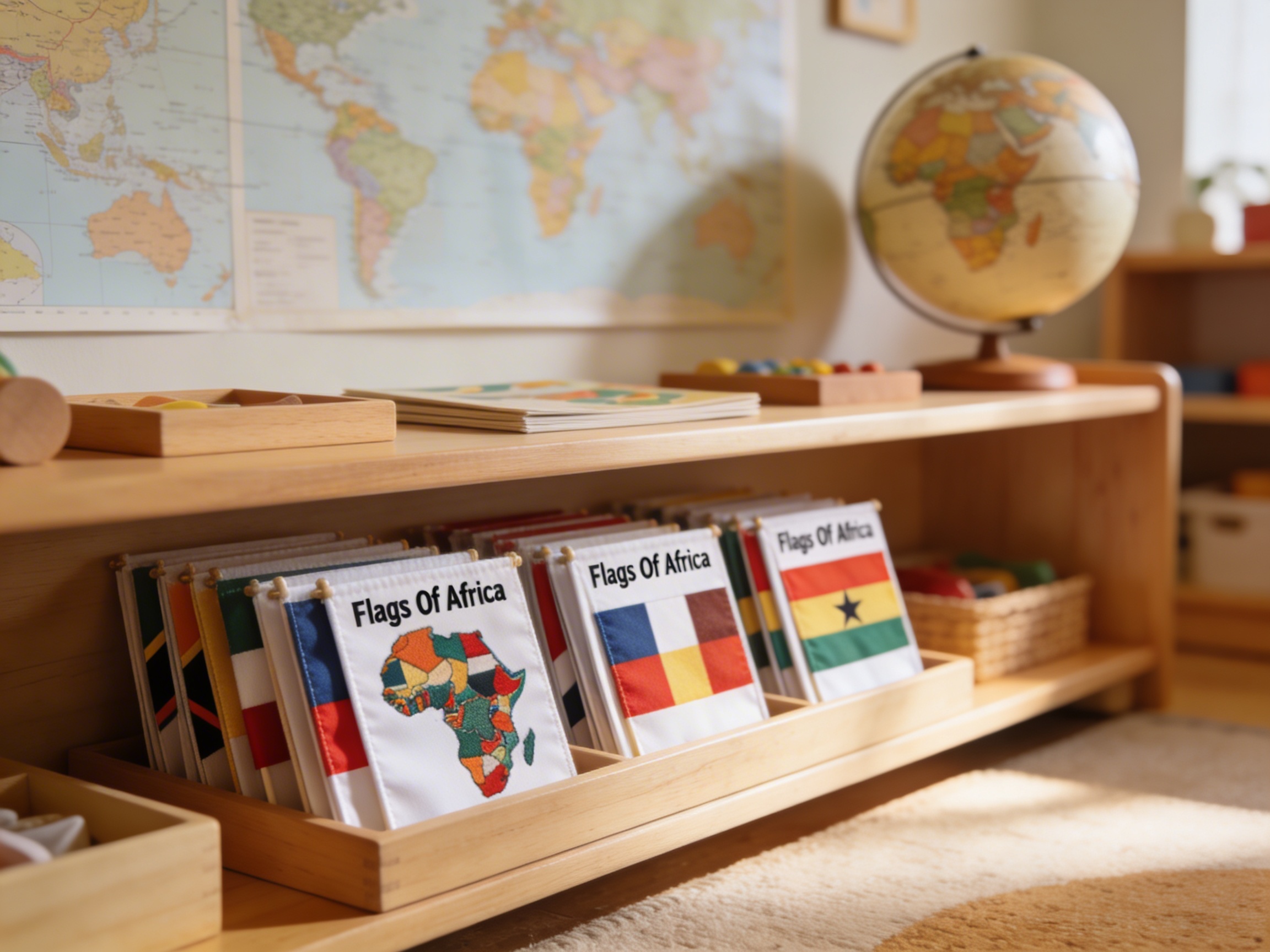 The Flags of Africa set addresses the young child's innate curiosity about the world beyond their immediate environment, introducing African nations through vibrant, laminated cards that children can handle repeatedly. Each flag card provides a concrete representation of an abstract concept—national identity—allowing children to build mental maps of Africa through visual and tactile exploration. The wooden storage box encourages orderly arrangement of the fifty-four flag cards, reflecting the Montessori principle that external order supports internal cognitive organization. By matching flag imagery with country name labels, children construct their understanding of African geography through their own discoveries rather than passive reception. The laminated cards withstand frequent handling as children sort, match, and arrange flags according to their observations of colors, patterns, and symbols. This geography material emerges from Dr. Montessori's vision of the child as a citizen of the world, where early exposure to diverse cultures through concrete materials like these flag cards cultivates respect and interest in humanity's rich tapestry.