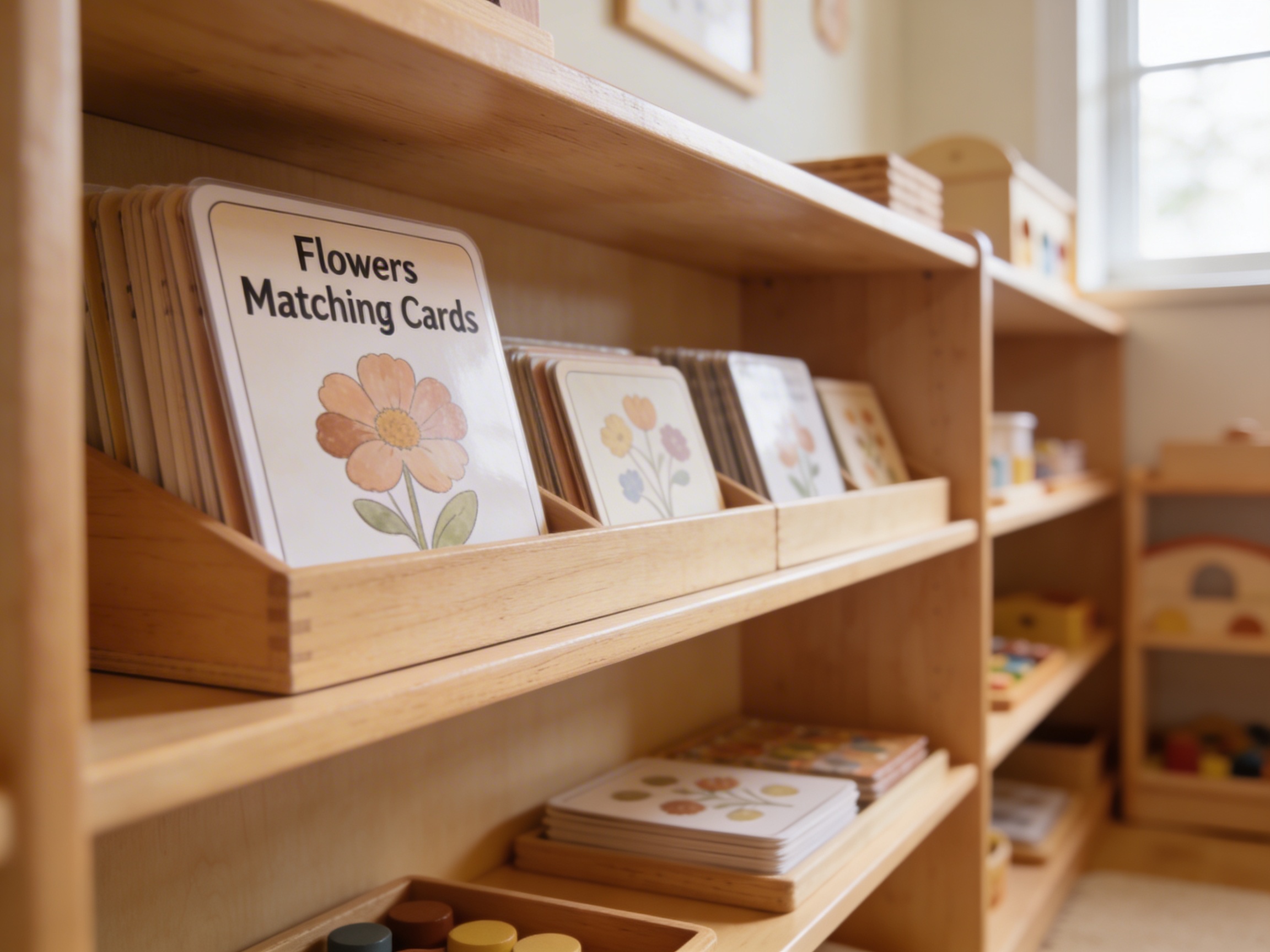 The Flowers Matching Cards fulfill the child's need to organize and classify the natural world during the sensitive period for order and language. Each laminated card presents one isolated flower photograph, allowing children to focus completely on distinguishing botanical characteristics without distraction. The color-coded borders on these matching cards provide a control of error, enabling independent verification of correct pairs. Through matching identical flower images, children develop visual discrimination skills essential for later reading and writing. The photographic clarity of each flower card connects classroom learning to real botanical specimens children encounter outdoors. These cards bridge the gap between concrete sensorial experiences with actual flowers and the abstract representation of botanical concepts. The durable laminated surface ensures repeated handling as children return to match chrysanthemums, roses, and daisies while building precise botanical vocabulary.