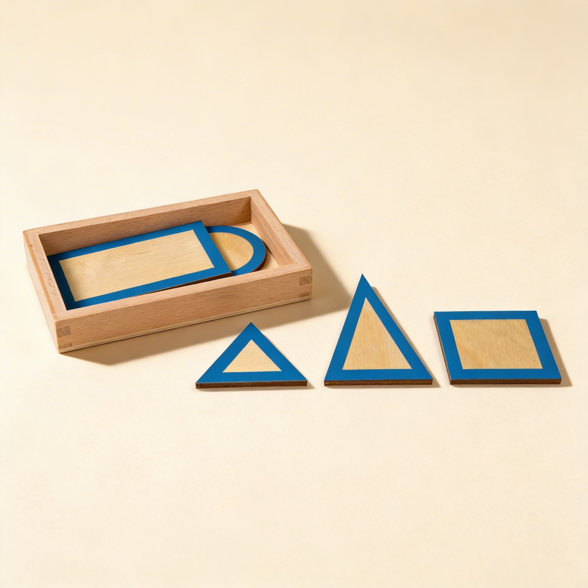 The Geometric Plane Figures embody Montessori's principle of isolating difficulty by presenting three distinct shapes that differ only in form. This material bridges the child's sensorial exploration with mathematical concepts, preparing the mathematical mind through concrete manipulation. The blue frames create visual boundaries that help children perceive the essence of each shape, while the natural wood centers provide tactile feedback. Through repeated handling and tracing, children develop muscle memory that supports later writing movements. This work satisfies the child's need for order through the storage box and precise presentation, while the beauty and simplicity of the materials attract the child's attention and invite exploration. The material serves as indirect preparation for geometry while directly refining visual discrimination and manual dexterity.