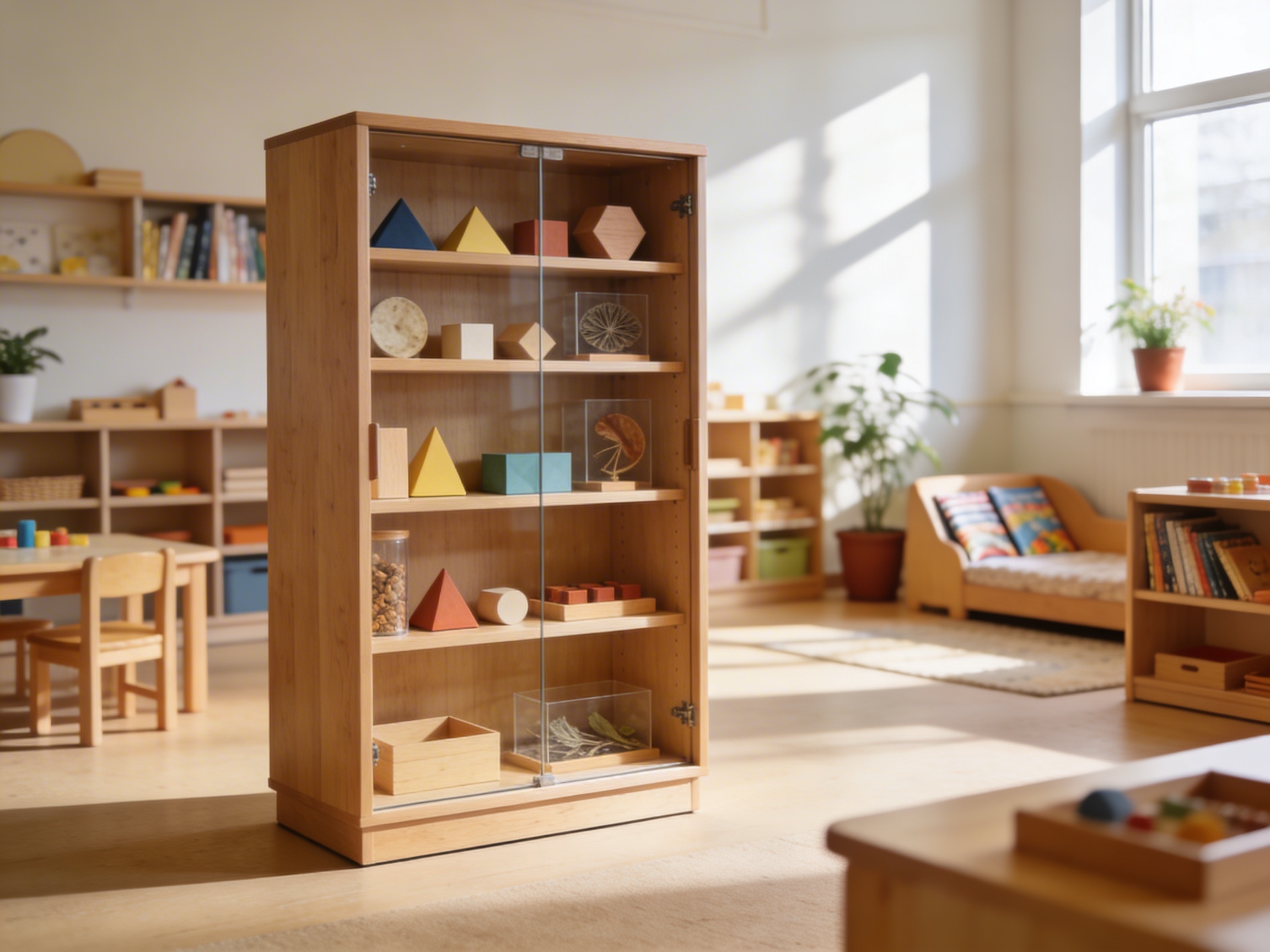 This cabinet maintains an organized, accessible environment essential for Montessori learning. The 93cm height is child-appropriate for ages 3-6, allowing independent material selection. The top display surface enables attractive material presentation, inviting exploration and maintaining classroom aesthetics.