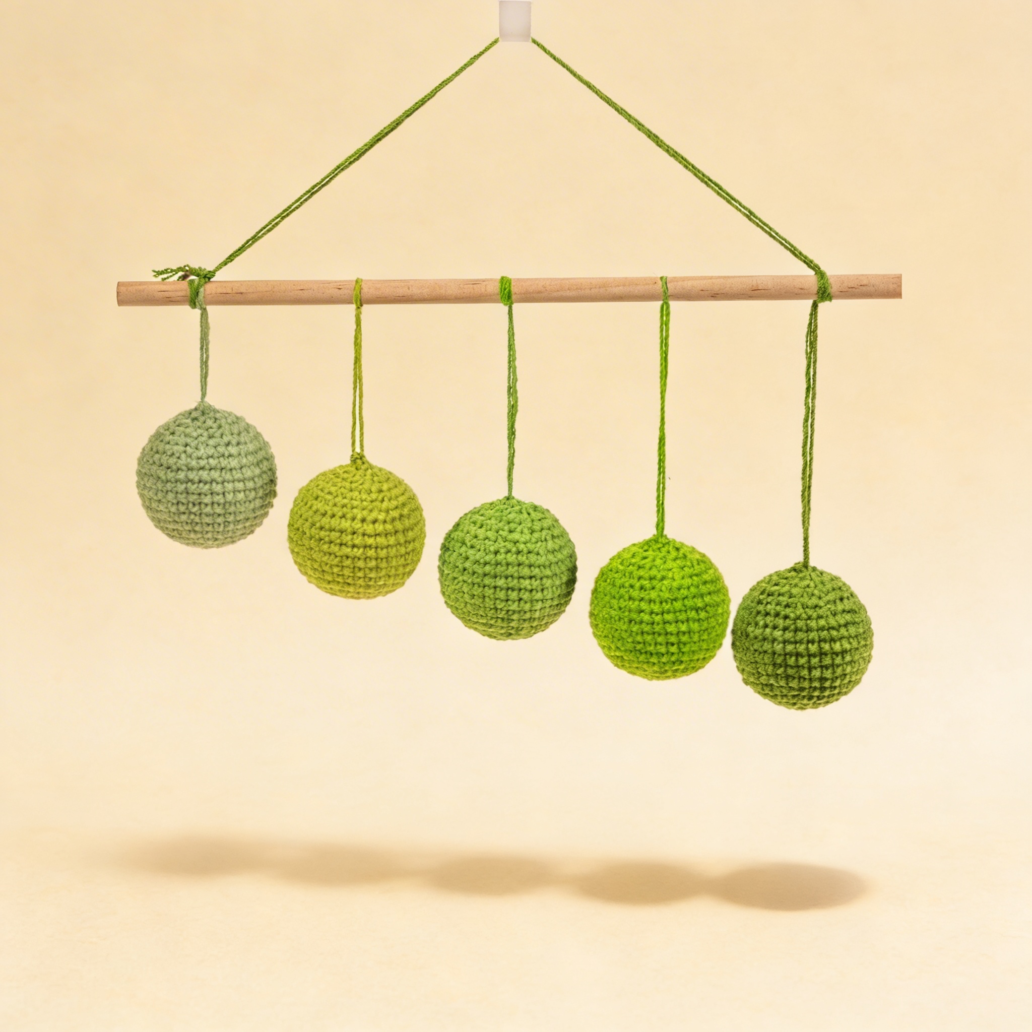 Each sphere is individually crocheted using soft, natural cotton yarn in carefully graduated tones. The consistent tension and smooth texture provide optimal visual contrast while ensuring safety for curious little hands.