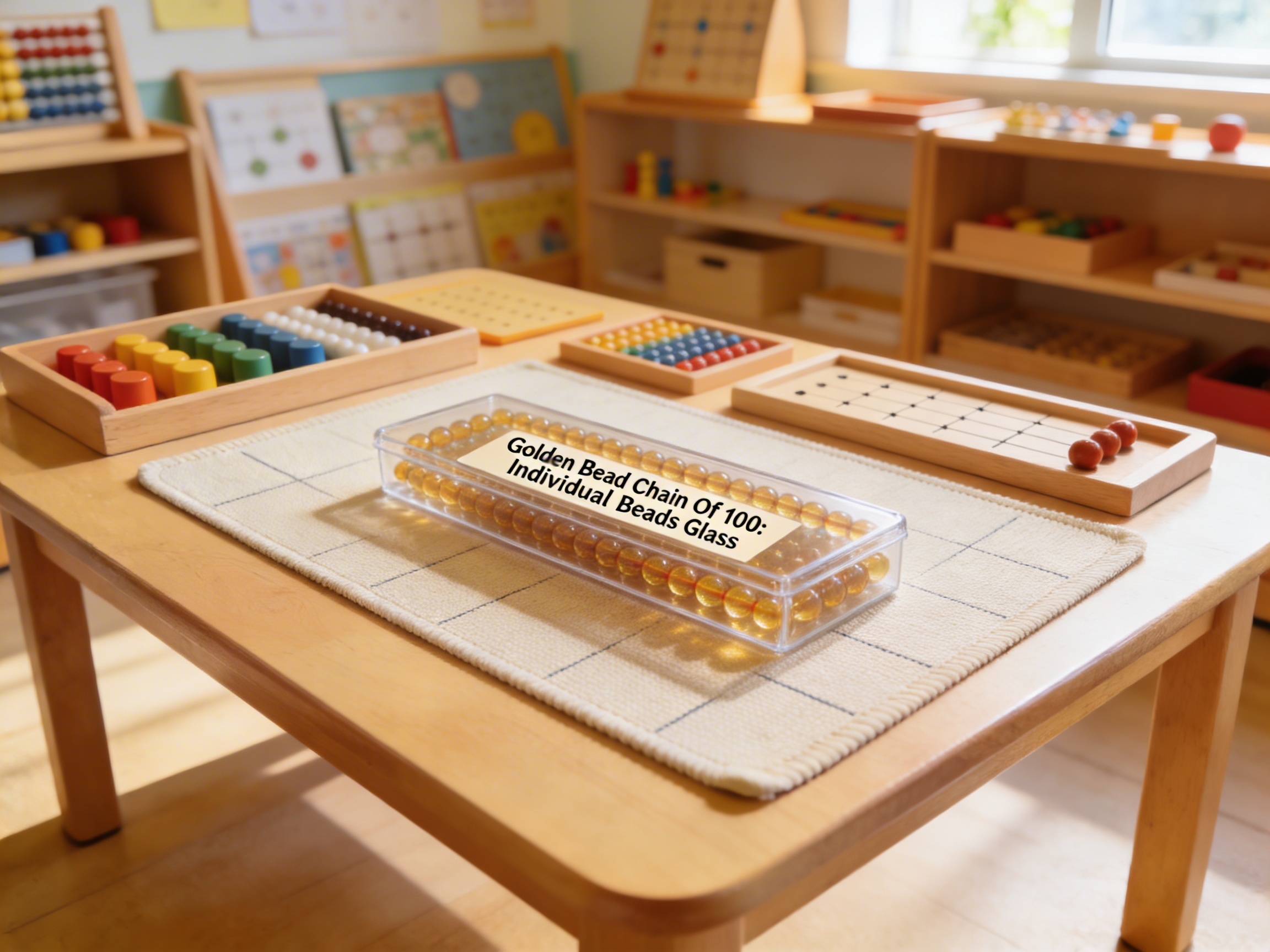 The Golden Bead Chain Of 100: Individual Beads Glass is a Mathematics Montessori material designed for children aged 3-6, crafted by Nienhuis Montessori to AMI standards.