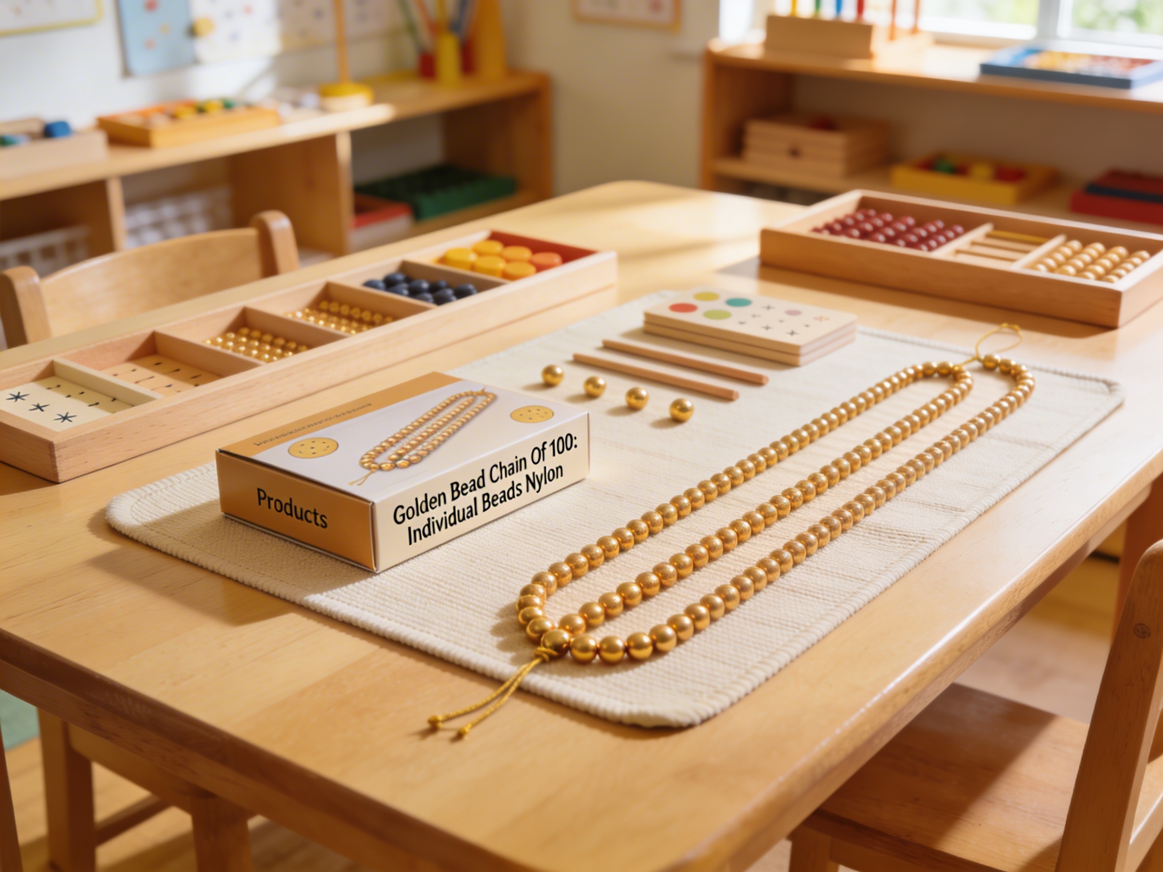The Golden Bead Chain Of 100: Individual Beads Nylon is a Mathematics Montessori material designed for children aged 3-6, crafted by Nienhuis Montessori to AMI standards.