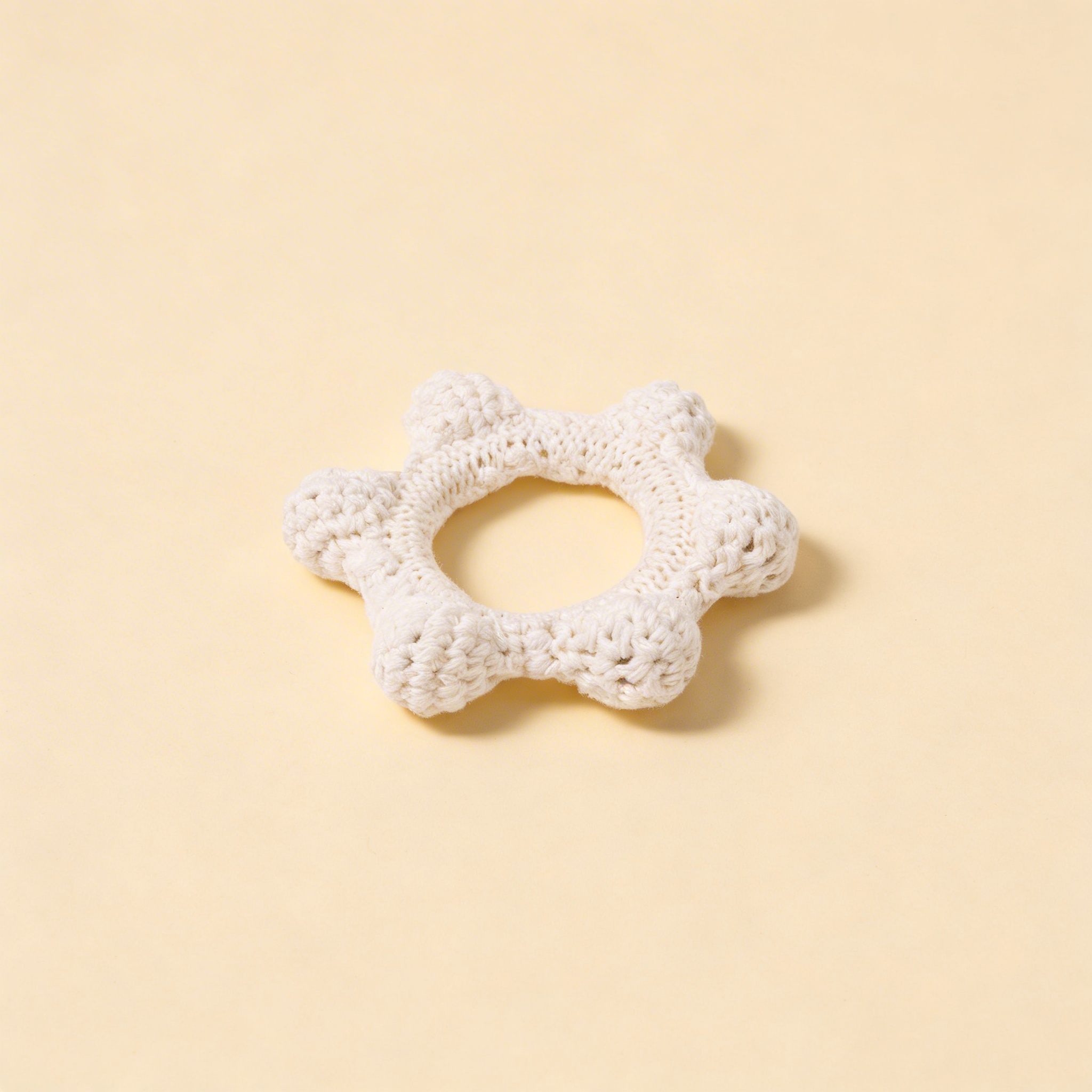 This hand-crocheted grasping ring provides the perfect first tactile experience for developing infants. The star-shaped design with soft bulbous points encourages bilateral coordination and fine motor development while the varied textures stimulate sensory exploration and visual focus.
