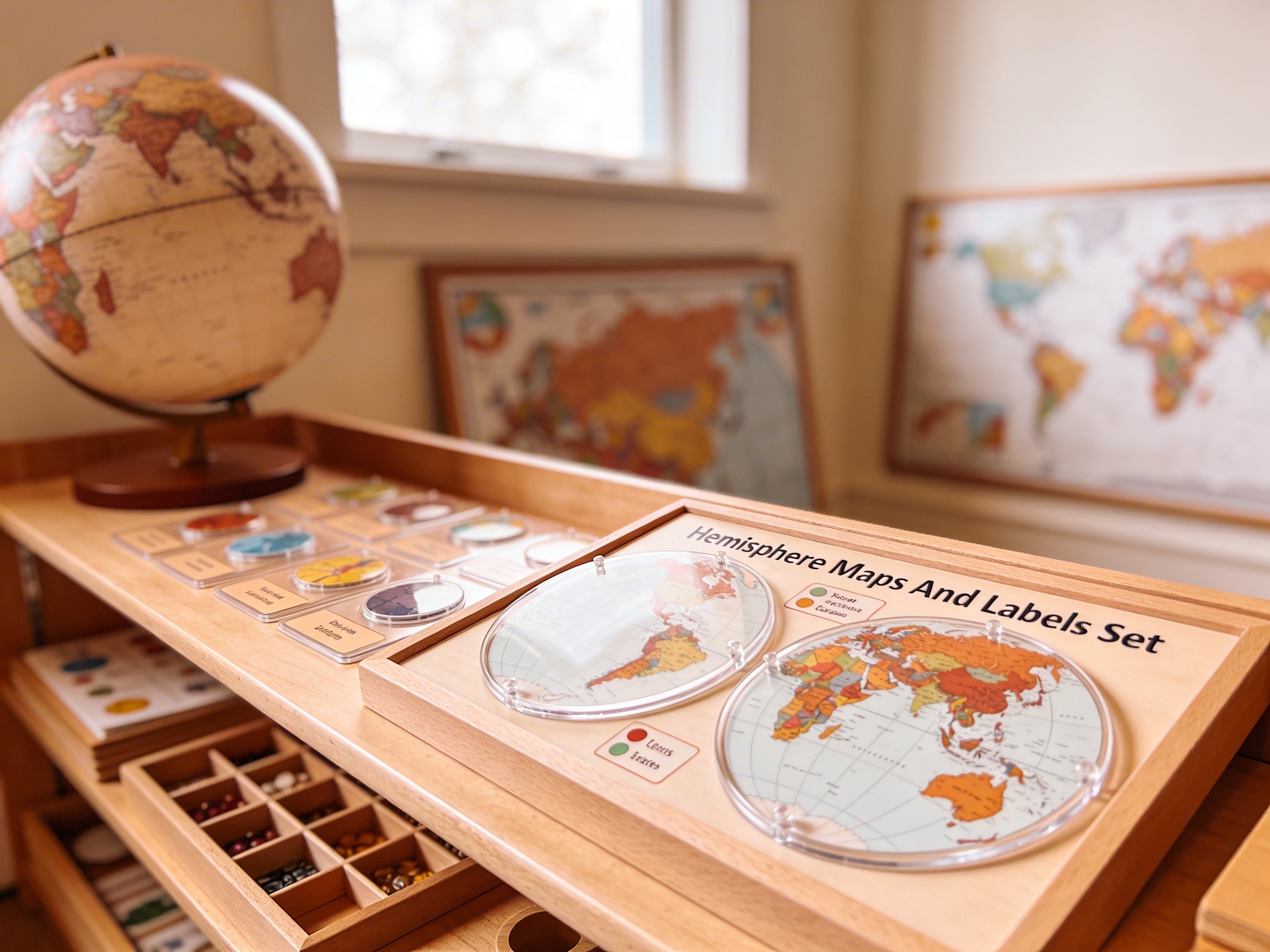 The Hemisphere Maps And Labels Set is a category.geography Montessori material designed for children aged 3-6, crafted by Nienhuis Montessori to AMI standards.
