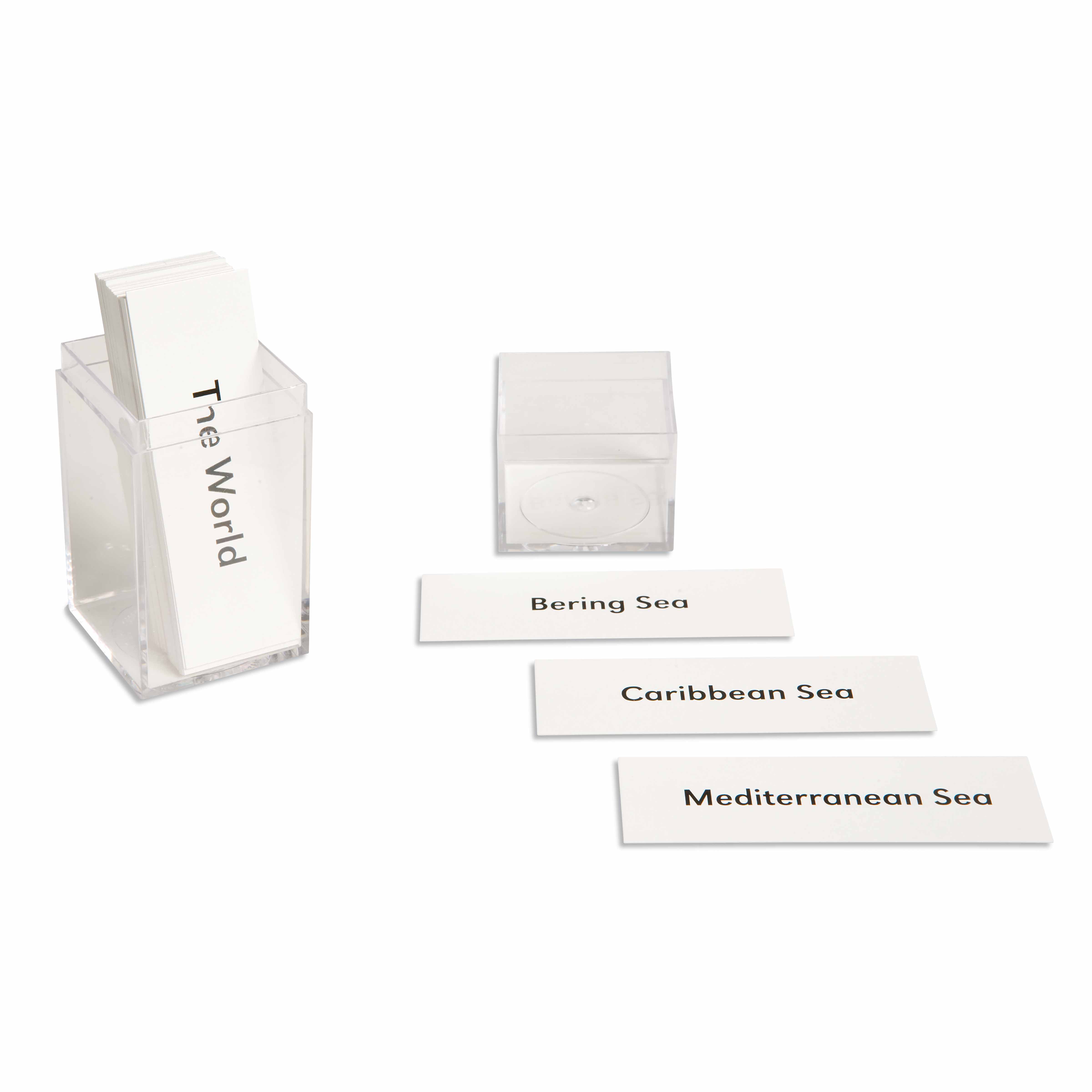 The set includes printed labeling cards featuring major seas and bodies of water from both hemispheres, along with a clear angled acrylic holder for organized display and easy access by young learners.