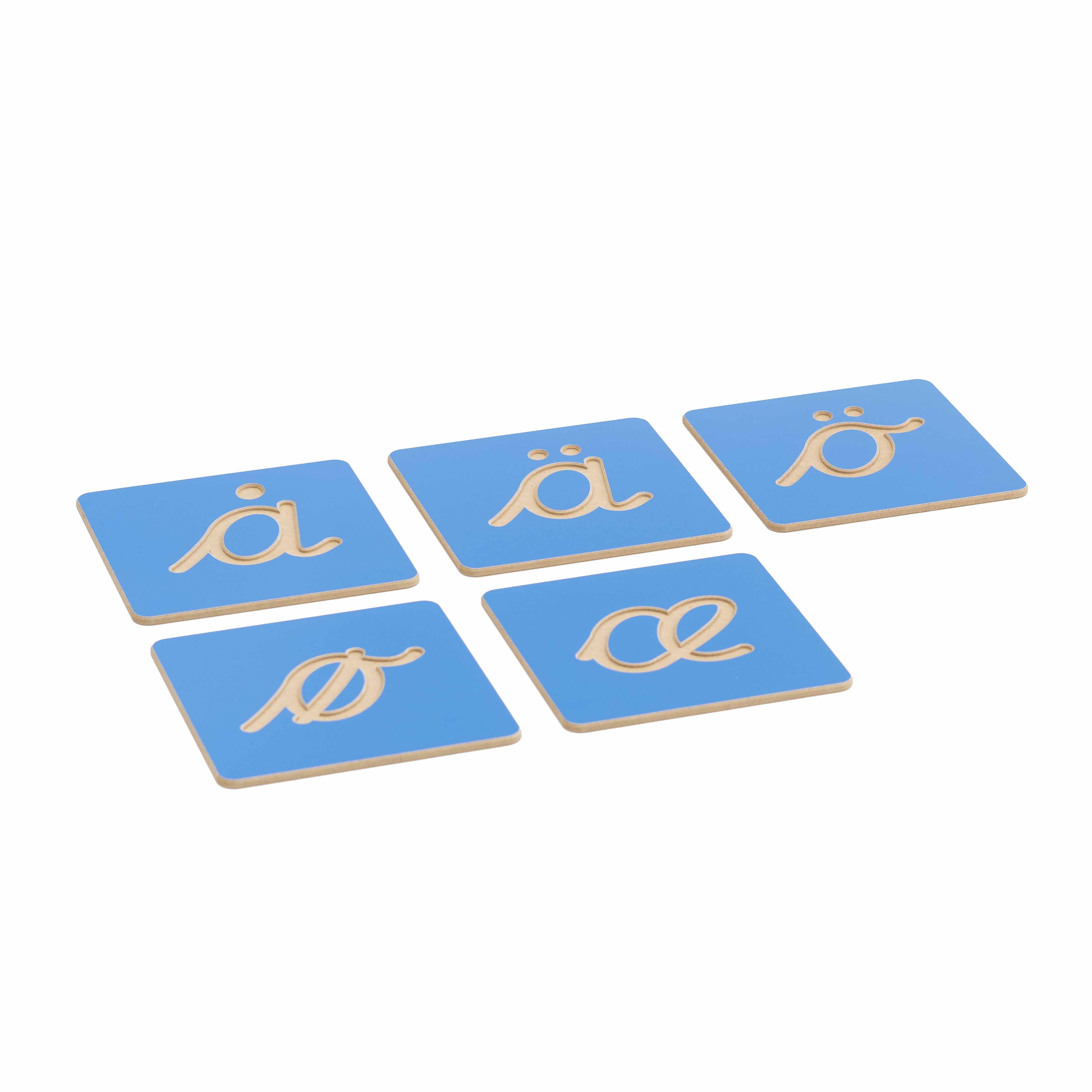 This supplement set includes additional Nordic cursive letters that complement the main alphabet set, providing extended practice opportunities for specific letter forms commonly used in Nordic languages. Each 10×10 cm board features one letter with a smooth blue painted groove.
