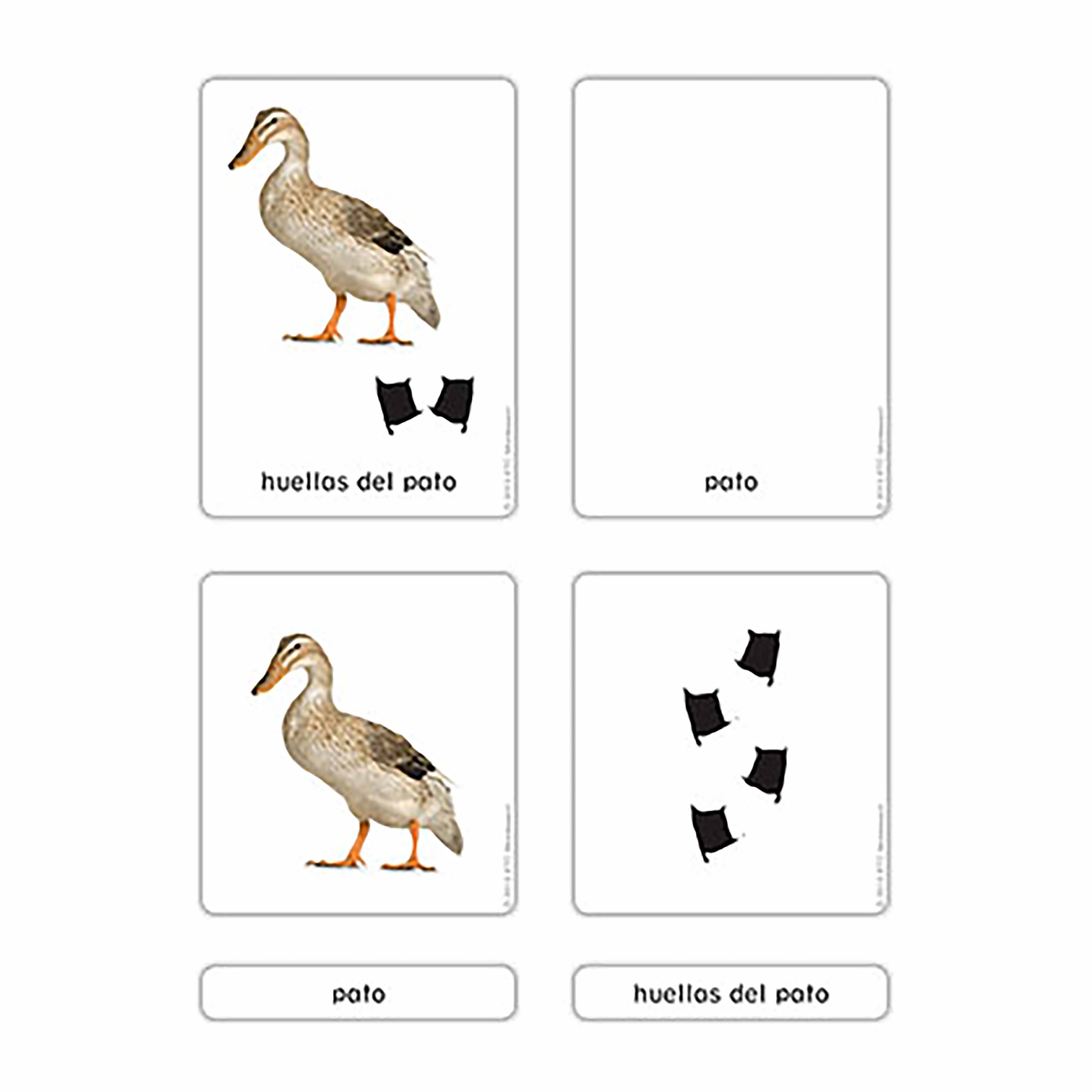 The Huellas De Animales De La Granja cards fulfill the young child's need to classify and categorize the natural world through concrete, visual experiences. These laminated three-part cards present farm animal footprints as a specific point of focus, allowing children to isolate one characteristic—the track pattern—and study it in detail. By matching realistic animal illustrations with their corresponding footprint patterns, children engage in meaningful discrimination work that builds their powers of observation. The cards' focus on familiar barnyard animals like ducks and chickens connects to children's existing experiences while introducing scientific observation methods. This material bridges the gap between the child's sensorial exploration and their growing interest in biological classification, presenting footprint recognition as a concrete way to understand how different animals move through their environment. The three-part card format of Huellas De Animales De La Granja allows for self-correction and repeated practice, essential for developing visual discrimination skills.