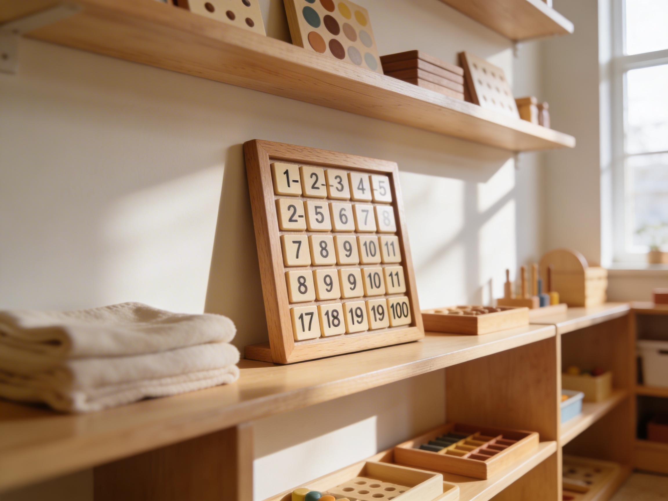 The Hundred Board is a fundamental Montessori mathematics material that helps children explore number patterns, sequences, and relationships from 1 to 100. This comprehensive set features a wooden board with a blue 10x10 grid and 100 numbered tiles stored in a compartmented wooden box, enabling systematic exploration of the decimal system and number order.