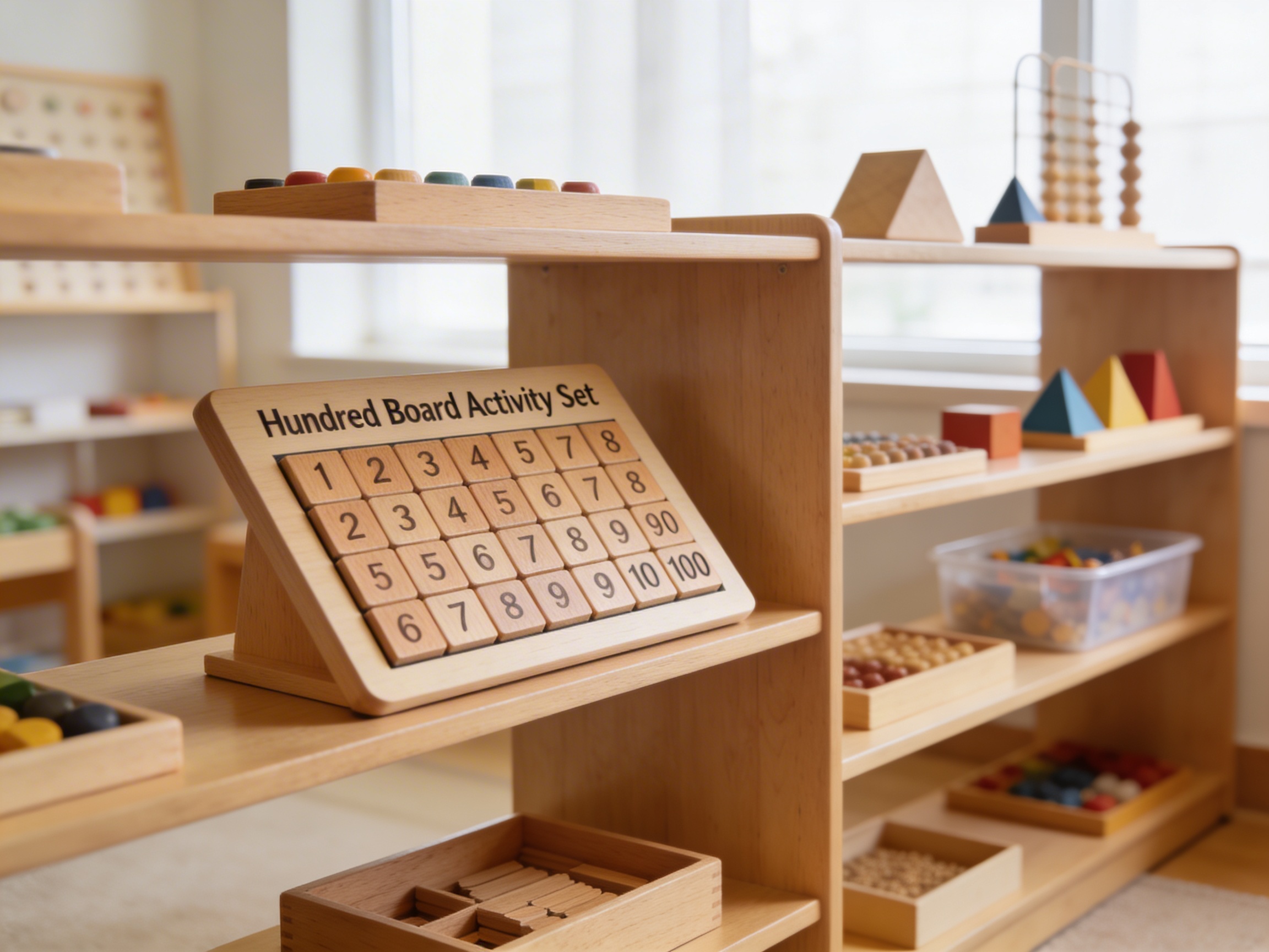 The Hundred Board Activity Set embodies Maria Montessori's insight that children construct mathematical understanding through concrete manipulation before abstract reasoning. This wooden storage box with numbered dividers transforms the exploration of numbers 1-100 into a sensorial experience where children physically handle each number, discovering patterns through direct interaction. The Hundred Board's grid structure reveals the decimal system's architecture - showing how numbers grow by tens horizontally and by ones vertically. Activity cards within the set isolate specific numerical relationships, allowing children to discover skip counting, odd and even patterns, and multiplication facts through their own investigation. The wooden dividers create order within the storage box, teaching children that mathematics itself is a system of organized relationships. By arranging numbers on the hundred board grid, children internalize the base-ten structure that underlies all arithmetic operations.
