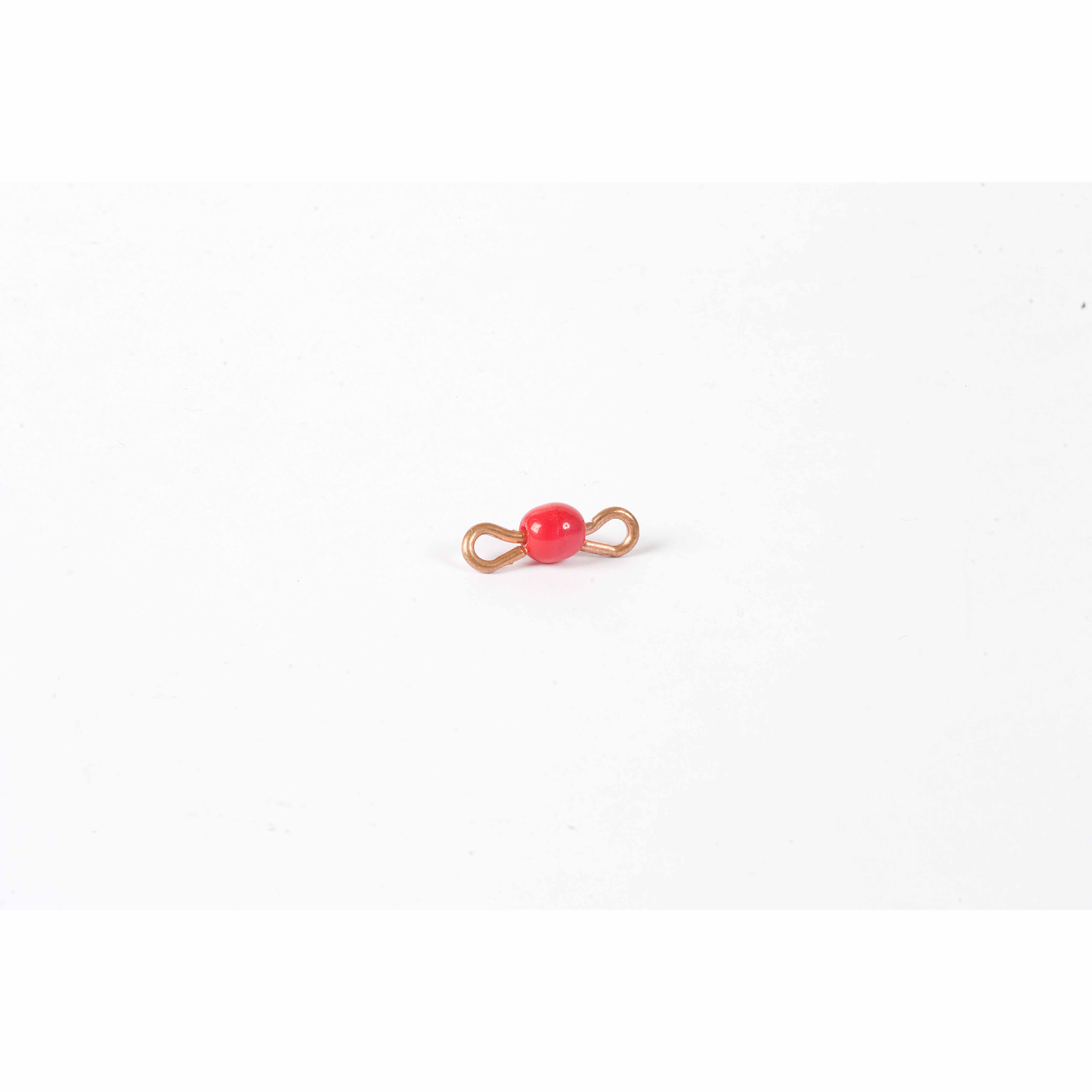 This individual glass bead bar represents the number 1 in the Montessori bead material system, featuring a single red glass bead mounted on wire. An essential component of the golden bead material and bead chains, this unit bead introduces children to the decimal system and serves as the foundation for understanding place value, addition, and subtraction operations.