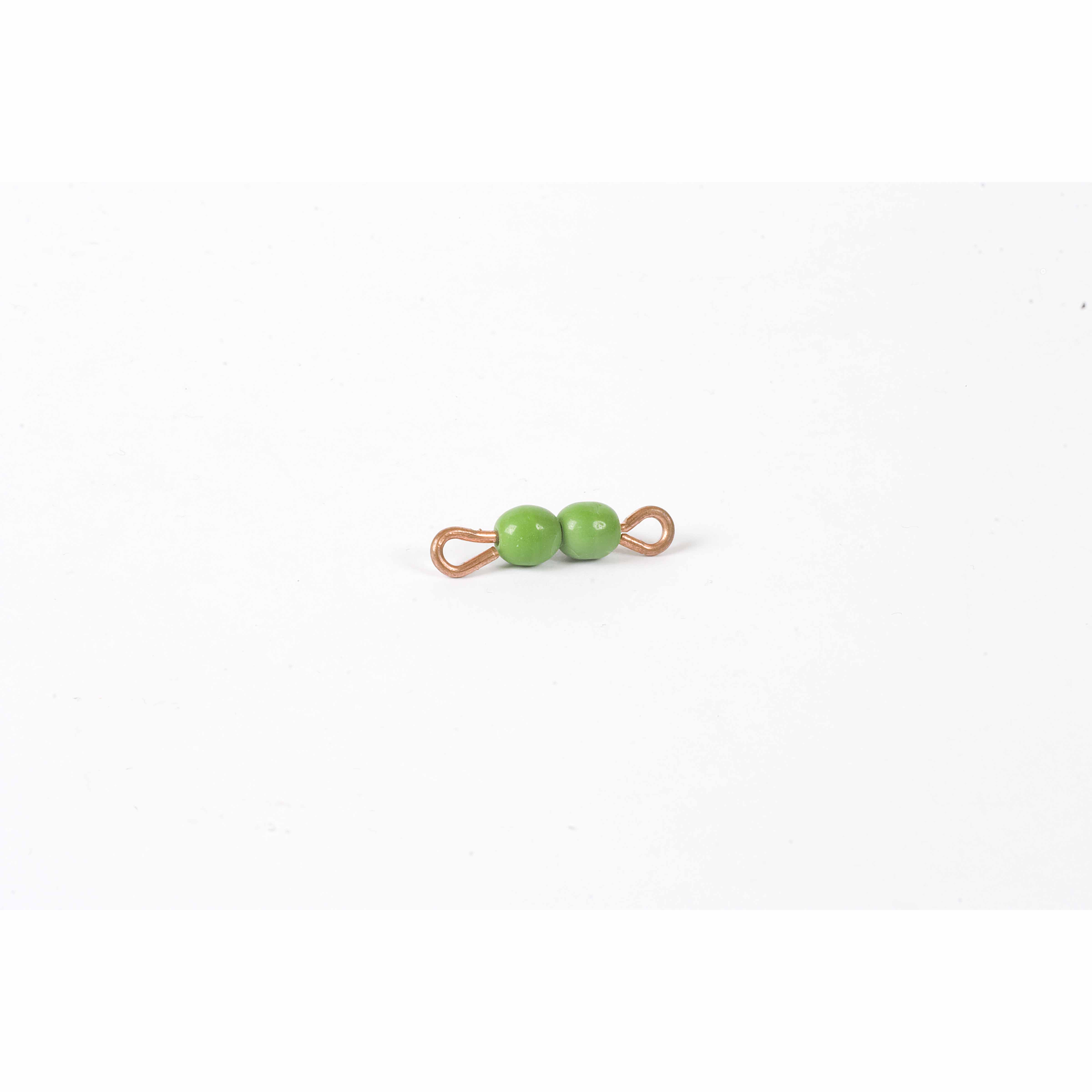 This Individual Glass Bead Bar of 2 represents the quantity two through paired green glass beads, forming an essential component of the Montessori bead material system. The precisely crafted bar features two identical spherical glass beads secured on metal wire, providing a tactile and visual representation that supports early mathematical concepts and prepares children for addition, skip counting, and understanding even numbers.
