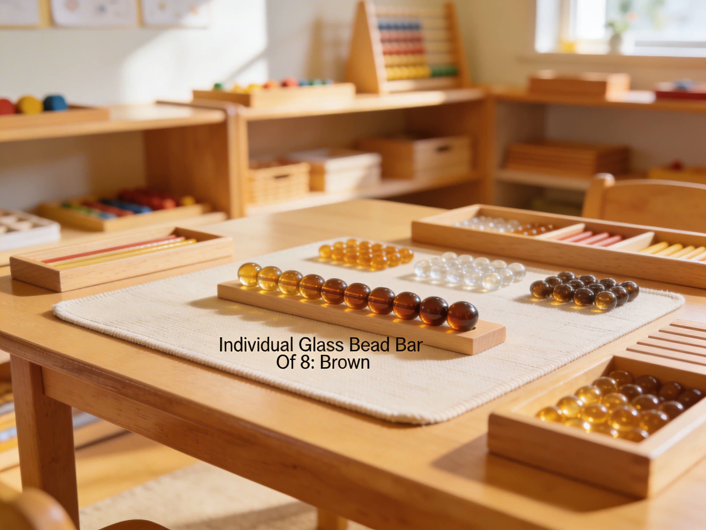 The Individual Glass Bead Bar of 8 represents a precise quantity through eight brown glass beads, enabling children to physically experience the concept of 'eight' before encountering abstract numerals. Each glossy bead invites touch and counting, while the brown color specifically designates this quantity in the Montessori color-coding system. The metal loops connecting these glass beads allow flexible manipulation, letting children bend and arrange the bar to explore how eight remains constant regardless of configuration. This bead bar bridges the gap between concrete counting and abstract number recognition, as children can hold 'eight' in their hands. The weight and texture of glass beads provide sensory feedback that reinforces quantity discrimination. When combined with other bead bars, this brown bar of 8 becomes part of a comprehensive system for building addition facts, skip counting patterns, and early multiplication concepts through hands-on exploration.