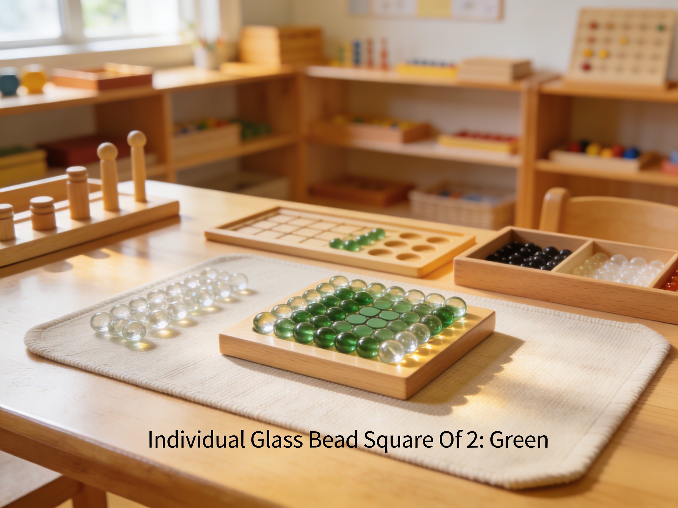 The Glass Bead Square of 2 introduces young children to the concept of squaring numbers through concrete manipulation. It visually represents 2² (2x2=4) with four green beads arranged in a square formation, helping children understand that squaring means multiplying a number by itself.