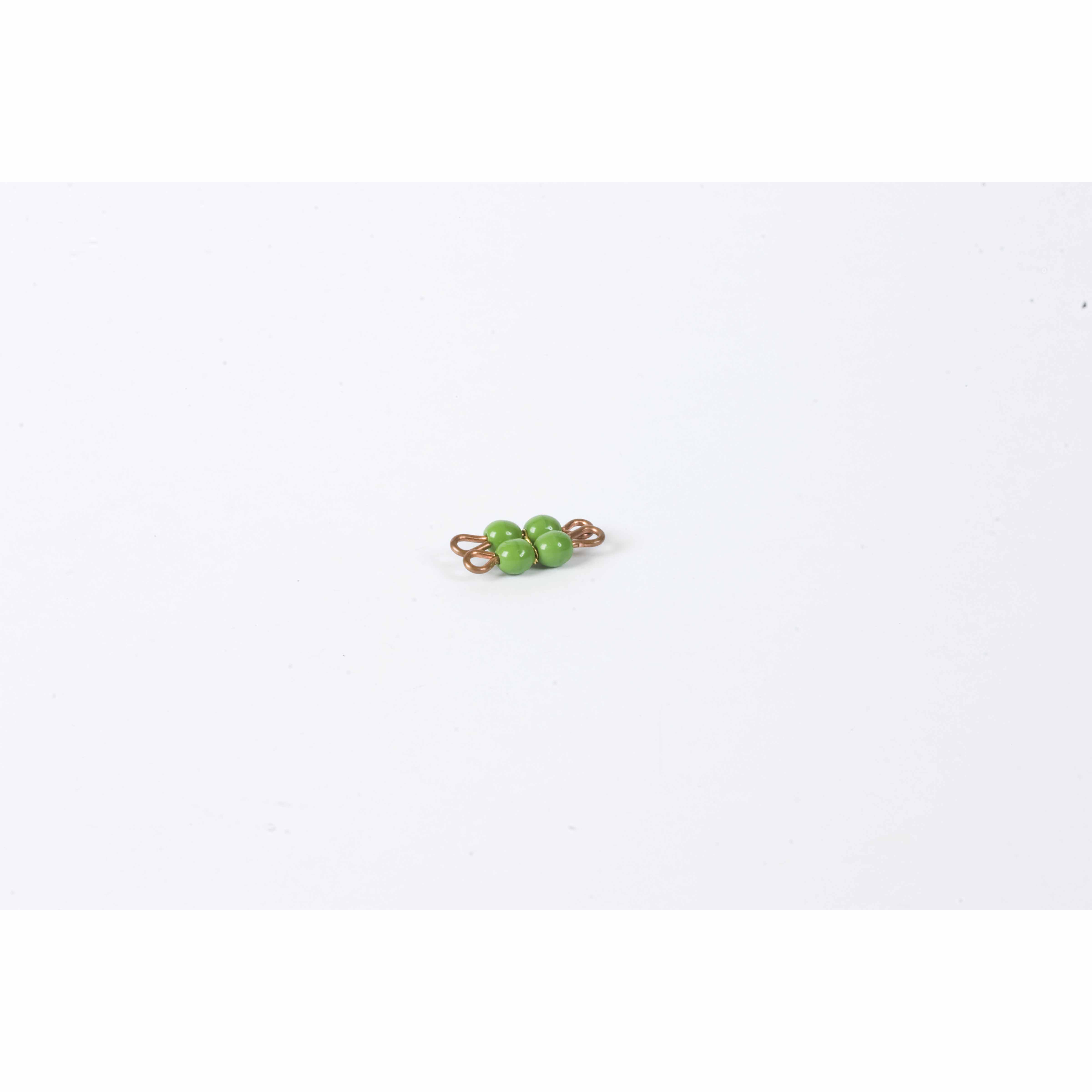 This Individual Glass Bead Square of 2 forms part of the Montessori bead materials system, featuring four green glass beads arranged on metal wire to represent 2². Essential for teaching mathematical concepts through concrete manipulation, this material helps children understand squaring numbers and builds the foundation for more complex mathematical operations.