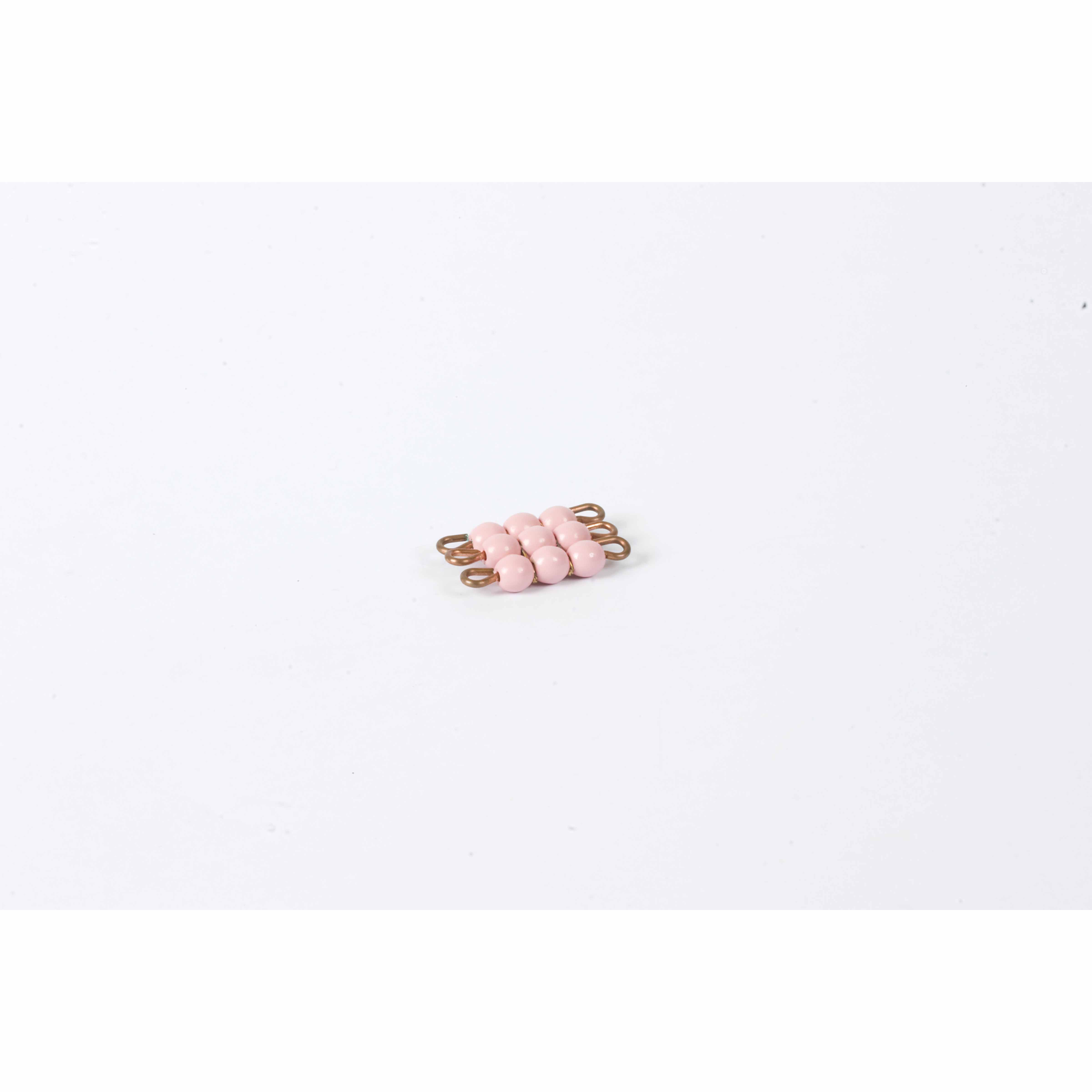 In Montessori mathematics, each number 1-10 has a specific color coding. Pink represents the number 3 throughout all bead materials, creating consistency that helps children recognize and work with the number 3 across different mathematical concepts and materials.
