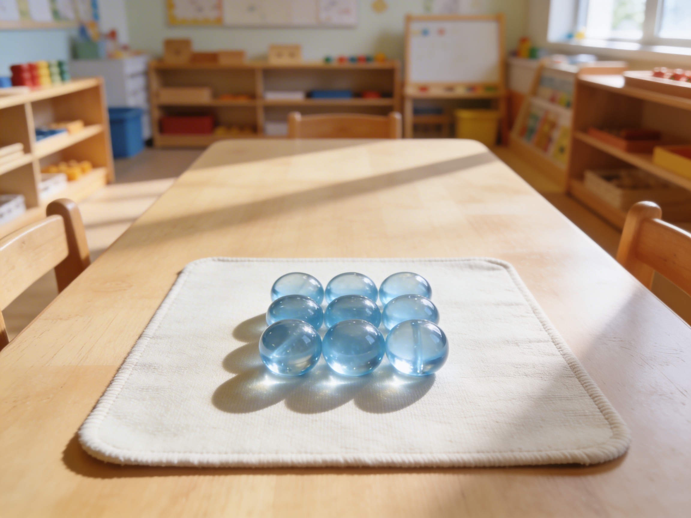 The smooth glass beads provide weight and substance that helps children understand the physical reality of mathematical quantities, while the light blue color coordinates with the broader Montessori color-coding system.