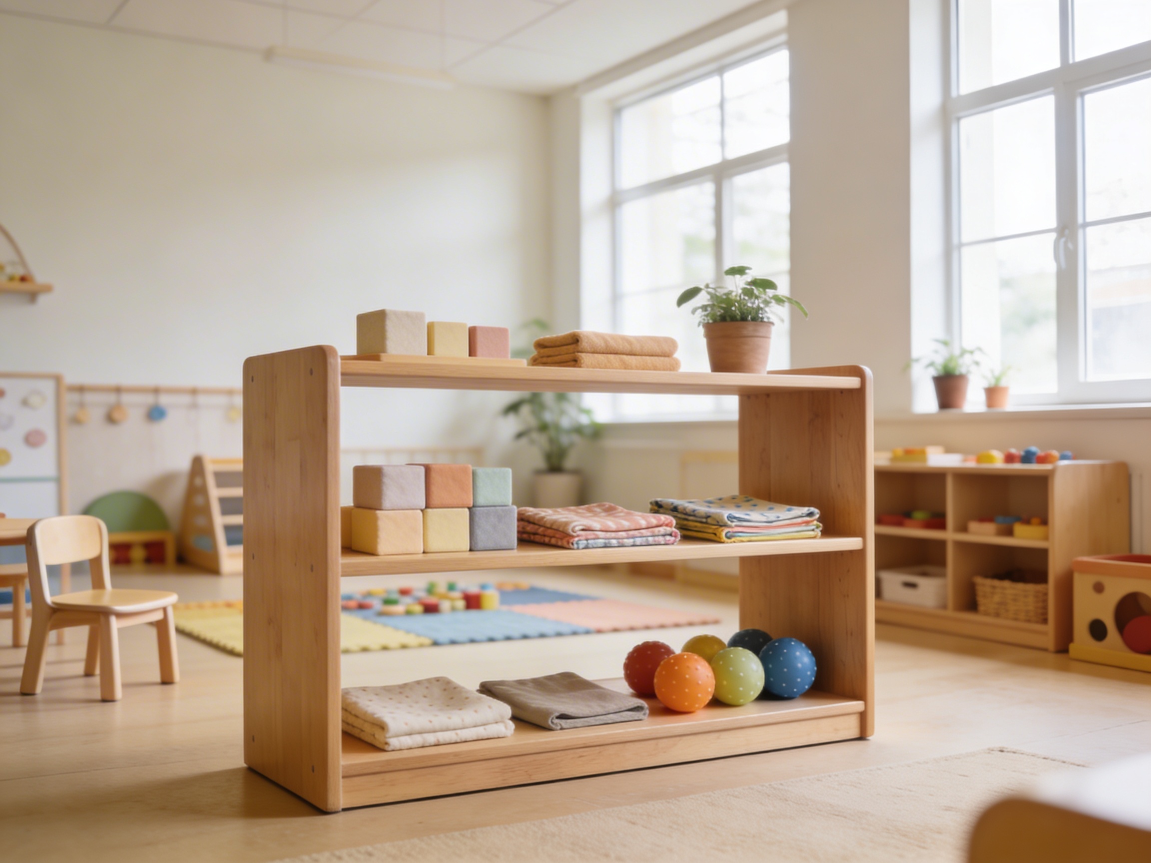 The low height and open design enable independent access, allowing infants and toddlers to choose their own materials, practice organizing, and develop autonomy in their learning environment.