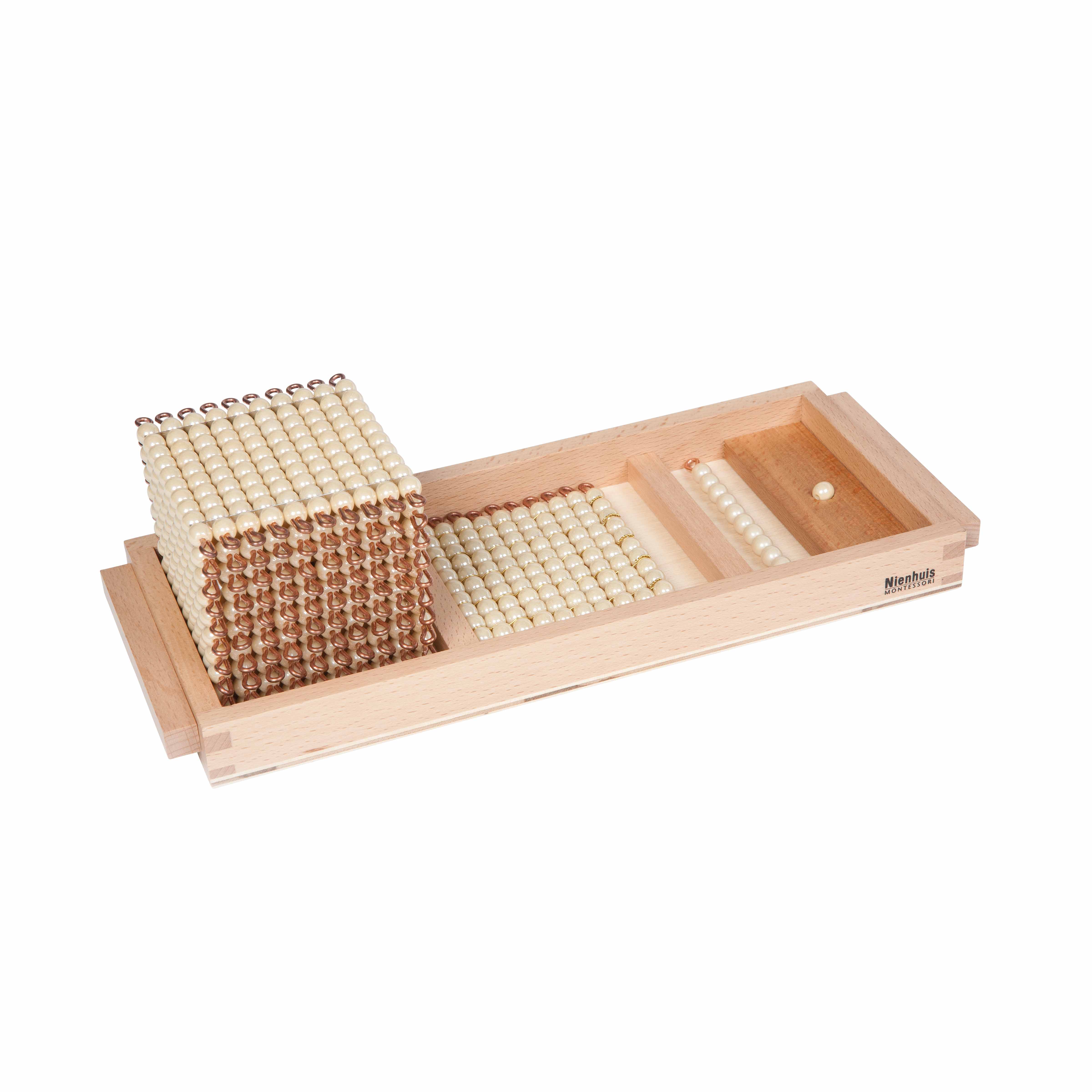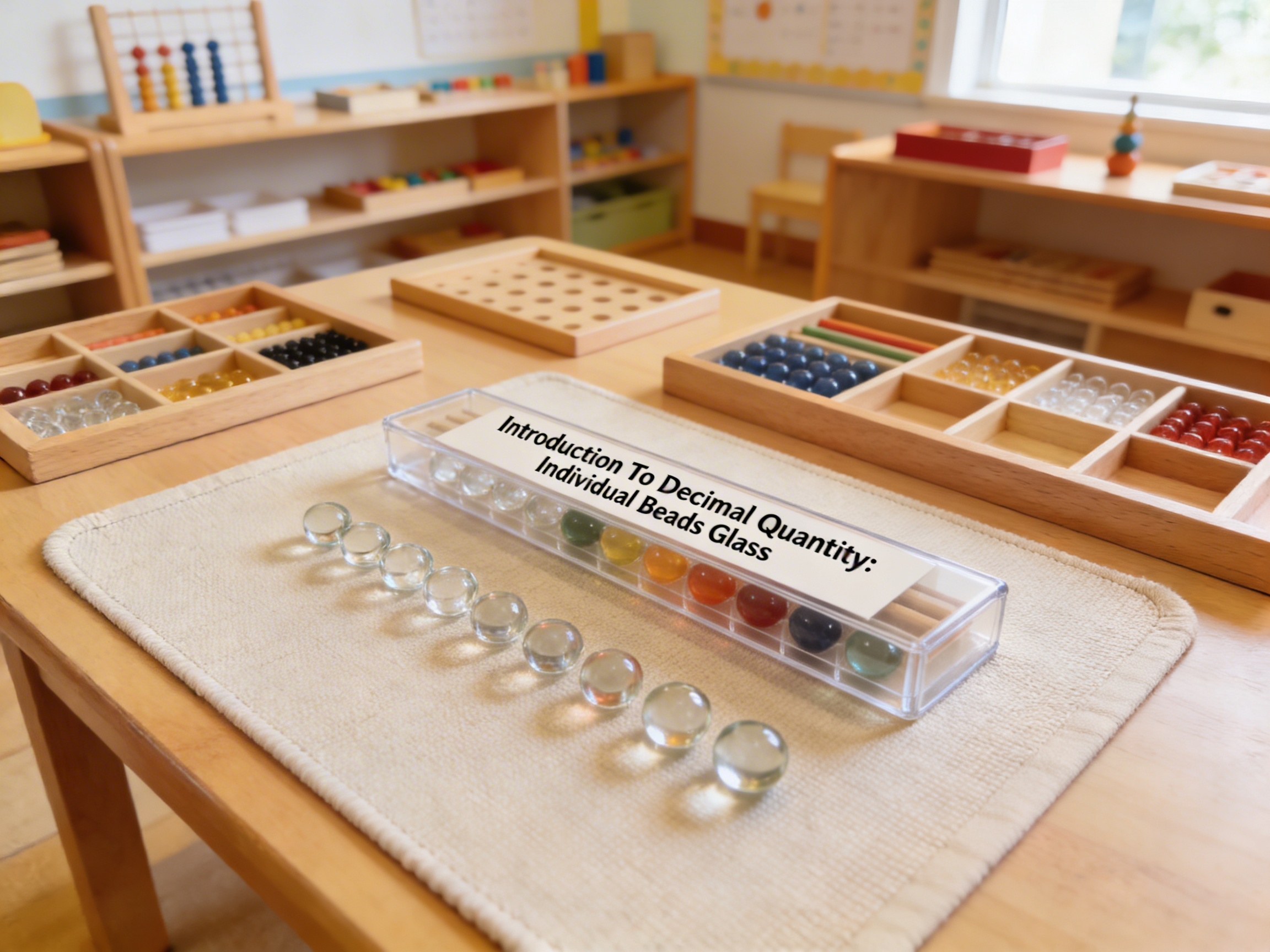 The Introduction To Decimal Quantity: Individual Beads Glass is a Mathematics Montessori material designed for children aged 3-6, crafted by Nienhuis Montessori to AMI standards.