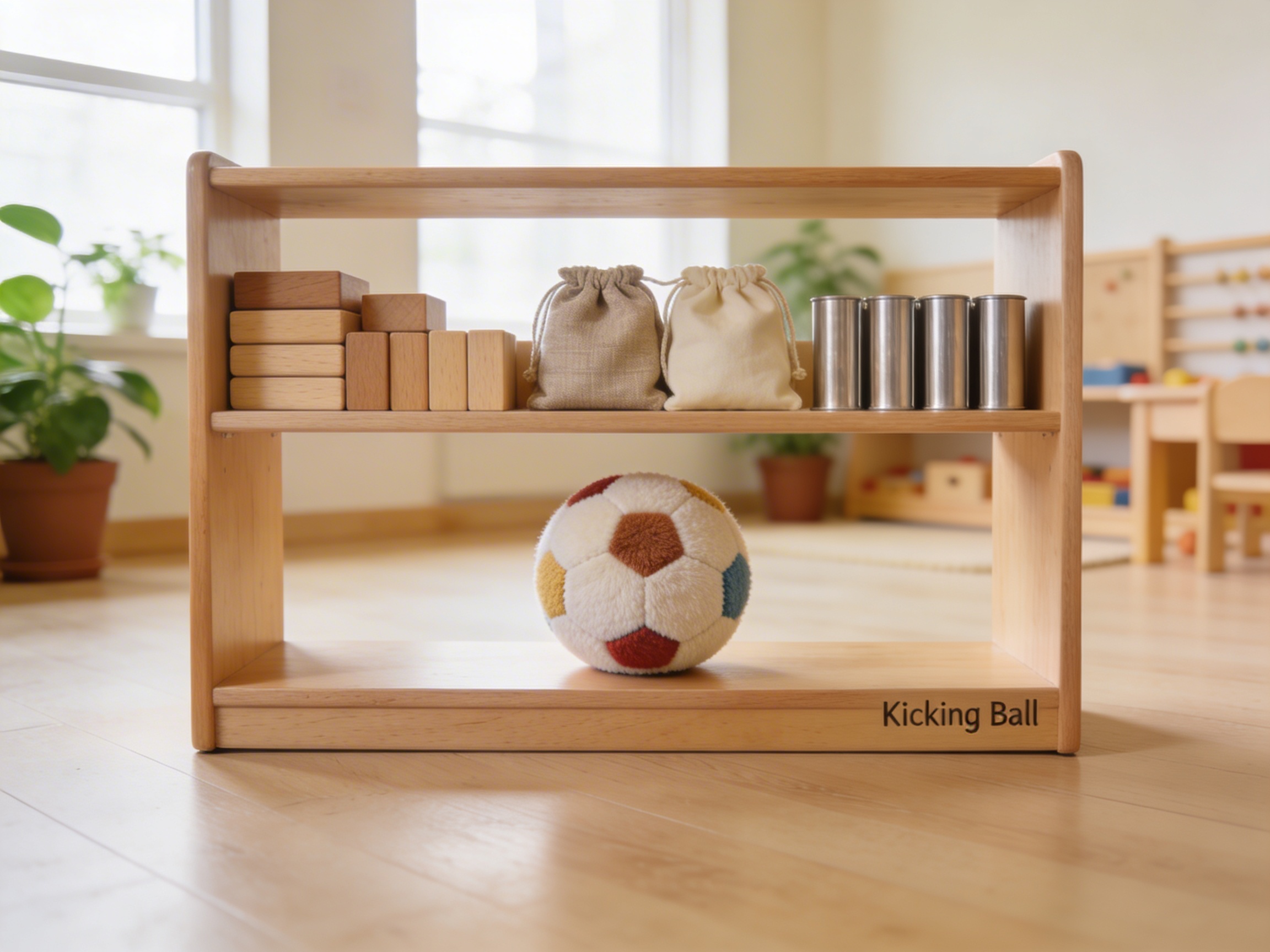 The Kicking Ball is a Educational Materials Montessori material designed for children aged 0-3, crafted by Nienhuis Montessori to AMI standards.