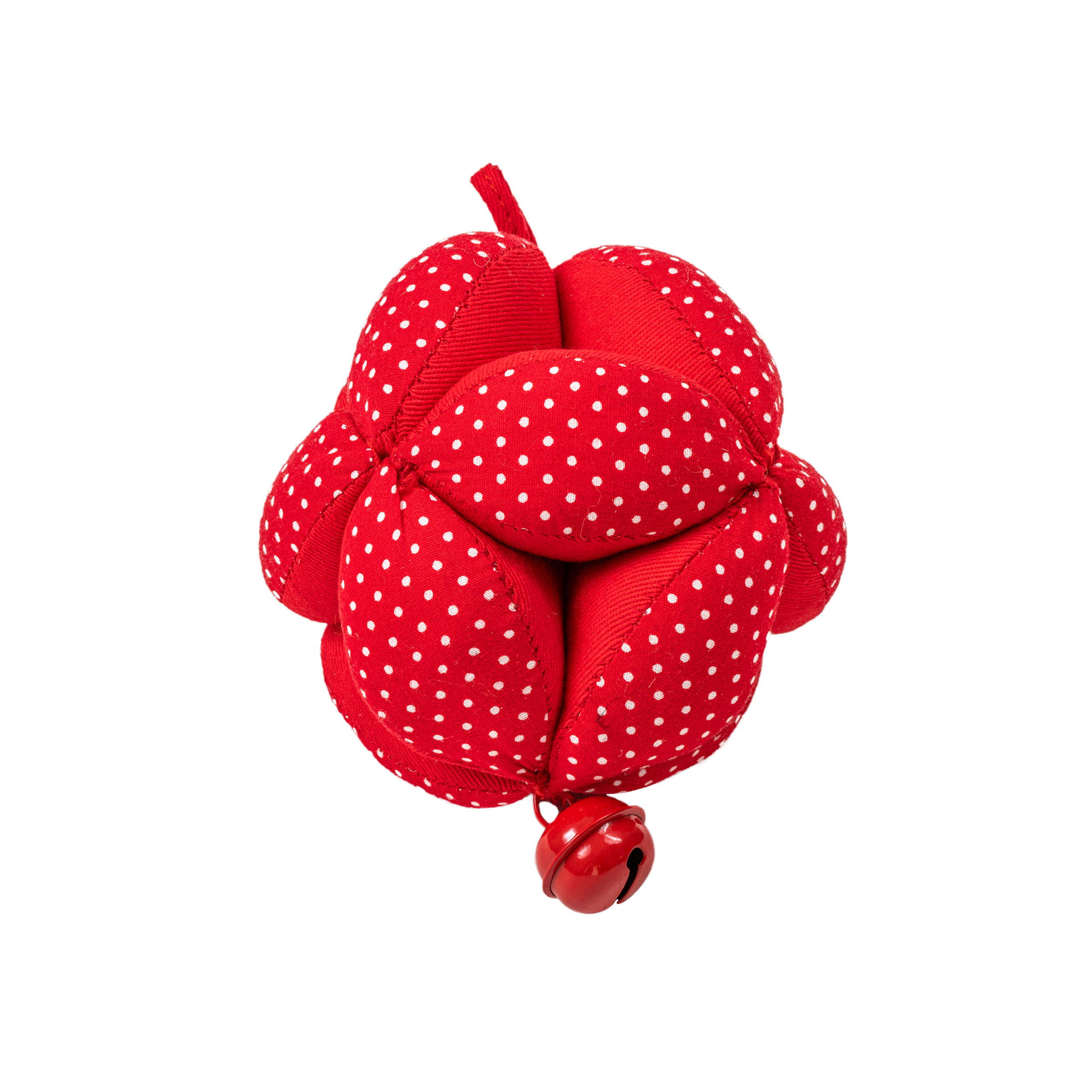 This engaging fabric kicking ball features a flower-shaped design with red polka dot fabric petals and an attached metal bell that creates gentle sounds with movement. Designed for infants in the pre-mobile stage, it encourages leg strengthening and cause-and-effect understanding as babies discover they can create sound through their kicks.