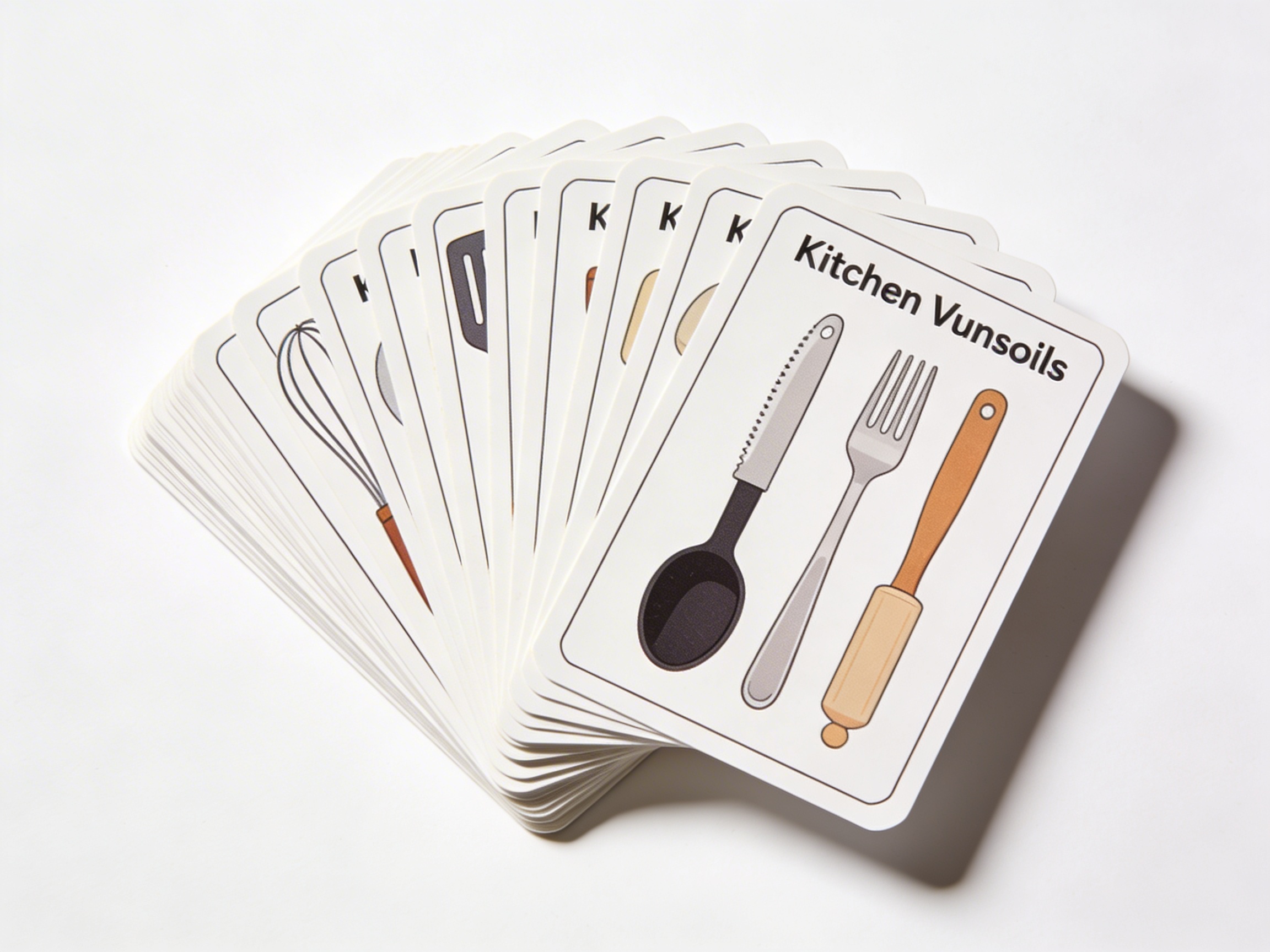 “Introduce real kitchen utensils alongside cards during initial presentations for concrete connections”