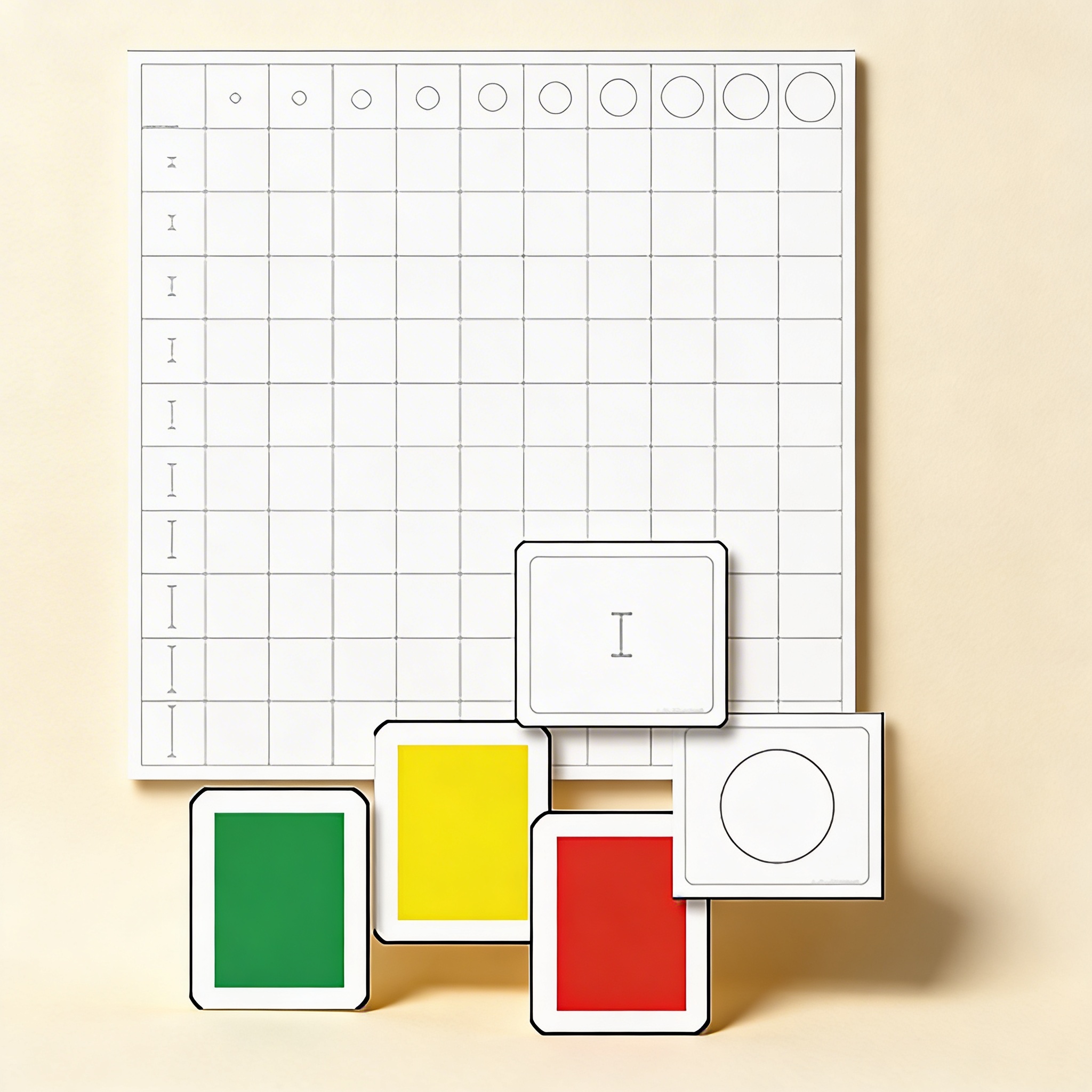 This Knobless Cylinder Chart extends the work with the Knobless Cylinders through precise visual discrimination and matching activities. The laminated chart features a 10x10 grid of graduated circles that correspond to the dimensions of the four Knobless Cylinder sets, accompanied by color-coded control cards for self-directed learning and error correction.
