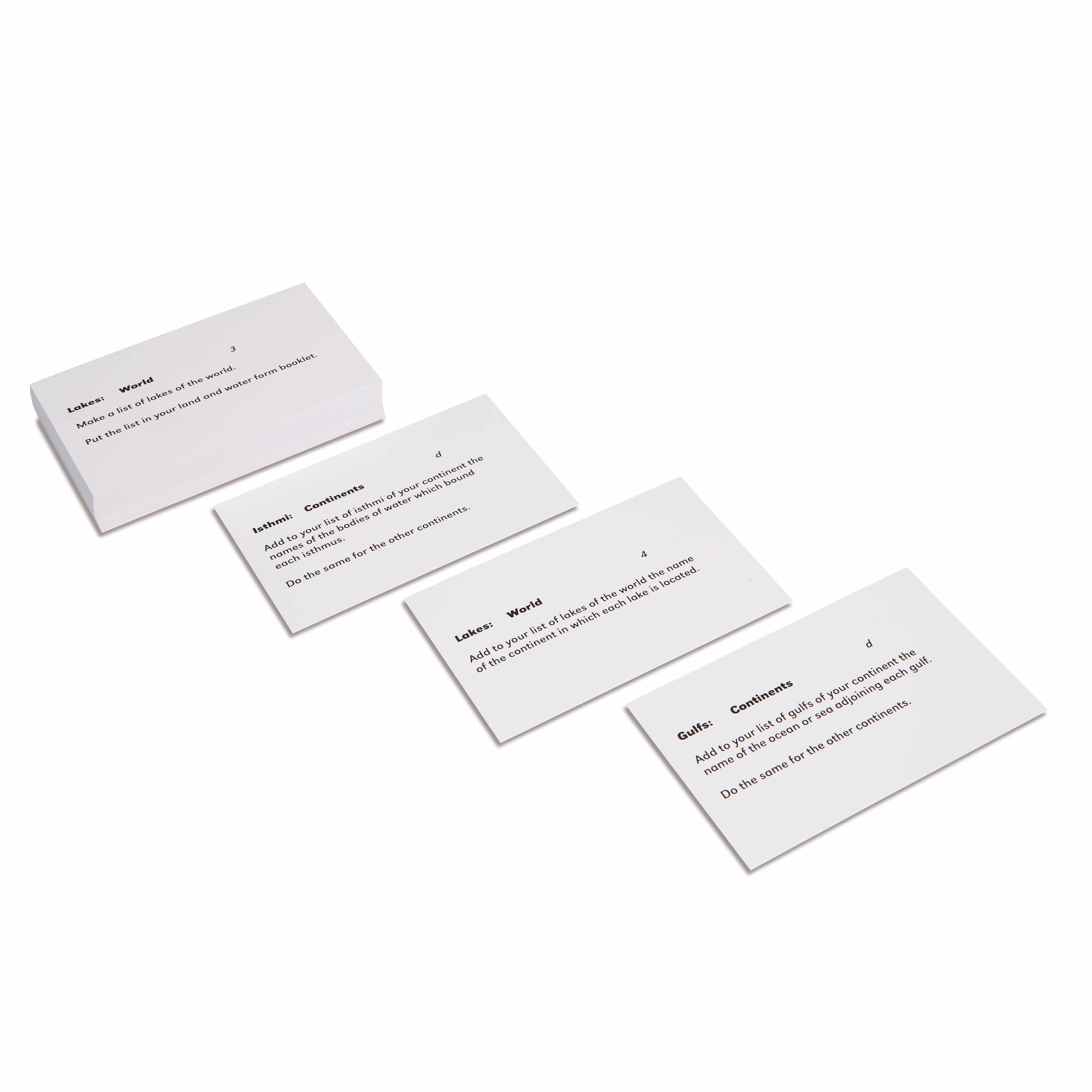 These Land and Water Forms Command Cards 2 provide precise geographical definitions to accompany the Montessori land and water form materials. Each laminated card presents clear, scientific terminology that helps children connect concrete sensorial experiences with abstract geographical concepts. The numbered sequence supports independent study and vocabulary enrichment for elementary geography work.
