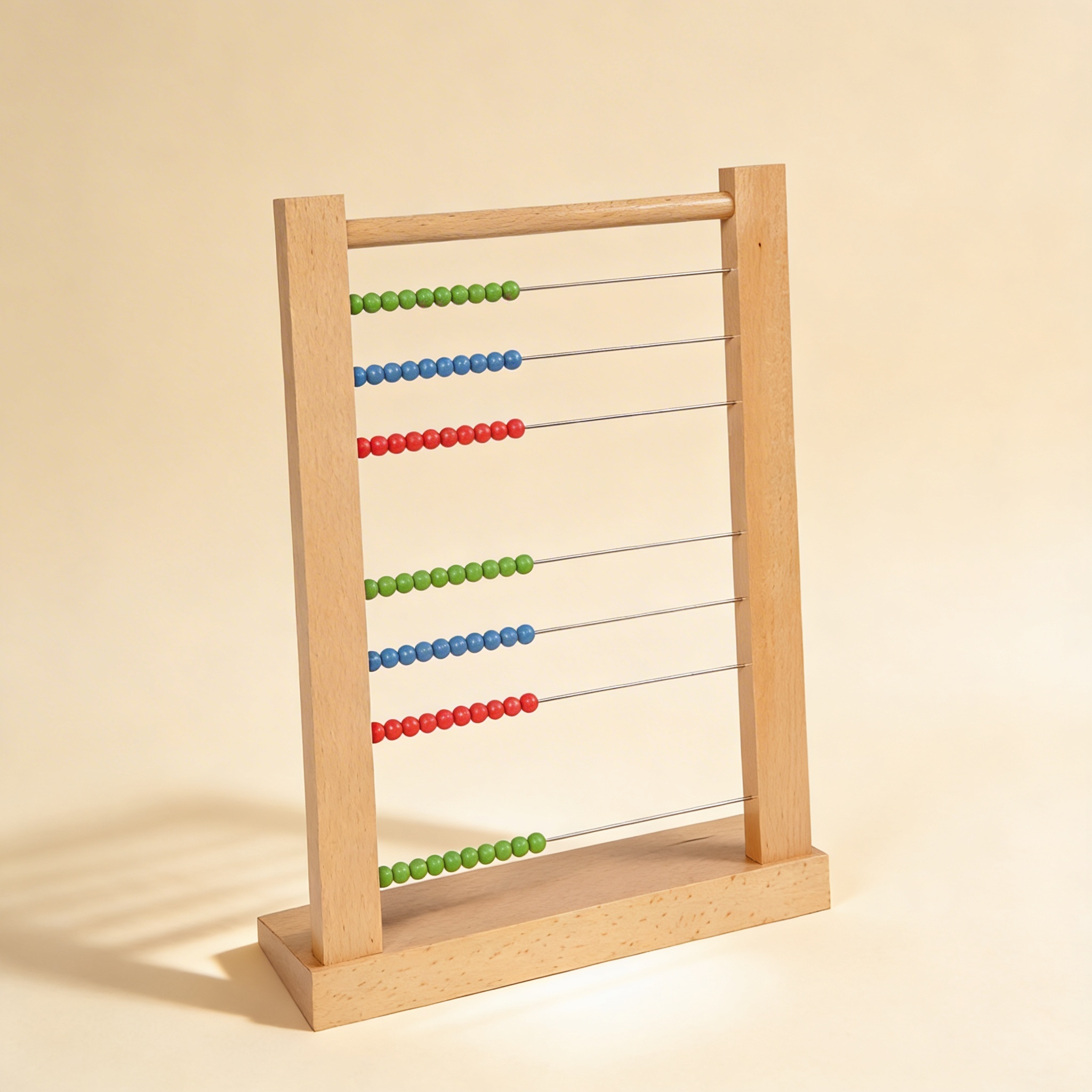 The Large Bead Frame embodies Montessori's principle of materialized abstraction, allowing children to physically manipulate quantities while building understanding of our decimal system. Through color-coded beads representing hierarchical place values, children experience the concrete reality of large numbers before moving to abstraction. This material honors the child's mathematical mind—their natural tendency to order, classify, and quantify their world. The frame's design isolates the difficulty of place value, enabling focused exploration without overwhelming complexity. By sliding beads with their hands, children internalize mathematical relationships through muscular memory and visual perception. This sensorial approach transforms abstract concepts into tangible experiences, following Montessori's observation that the hand is the instrument of the mind, and mathematical understanding develops from concrete to abstract through purposeful manipulation.