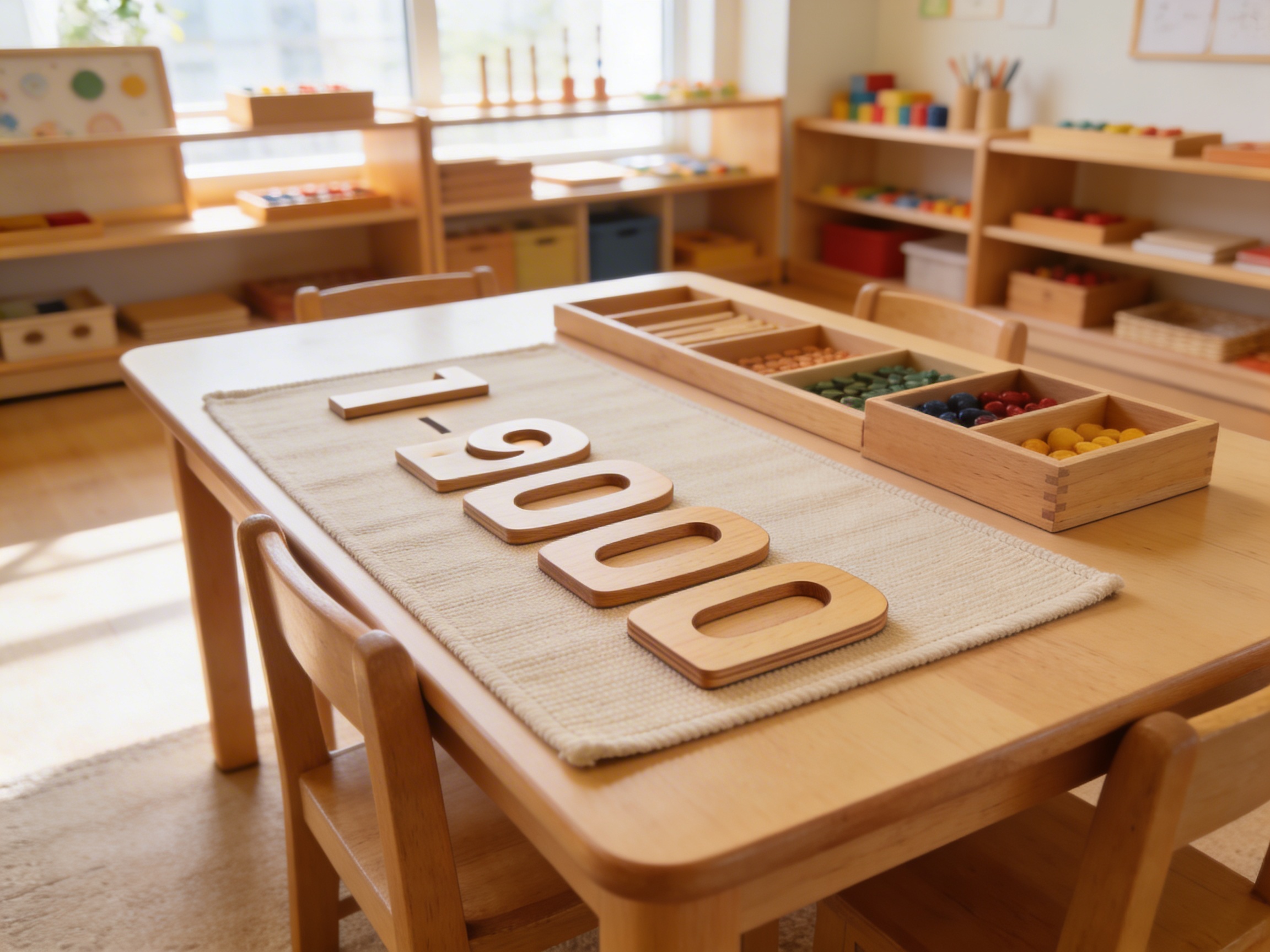 The Large Number Cards 1-9000 embody Maria Montessori's discovery that children possess a natural fascination with large quantities when presented concretely. These wooden cards transform abstract four-digit numbers into tangible objects that children can hold, arrange, and manipulate. The color-coding system—green units, blue tens, red hundreds, and green thousands—creates a visual pattern that helps children recognize how our decimal system repeats in cycles. By physically overlaying cards to build numbers from 1 to 9000, children experience place value through their hands before their minds fully grasp the concept. The large format of these wooden cards serves a specific purpose: when children spread them across a work mat, they can see the dramatic difference between 9 and 9000, making magnitude visible and touchable. The wooden stand with precisely spaced slots teaches systematic organization while the child discovers that 5000 requires only one card, but 5678 requires four cards working together.