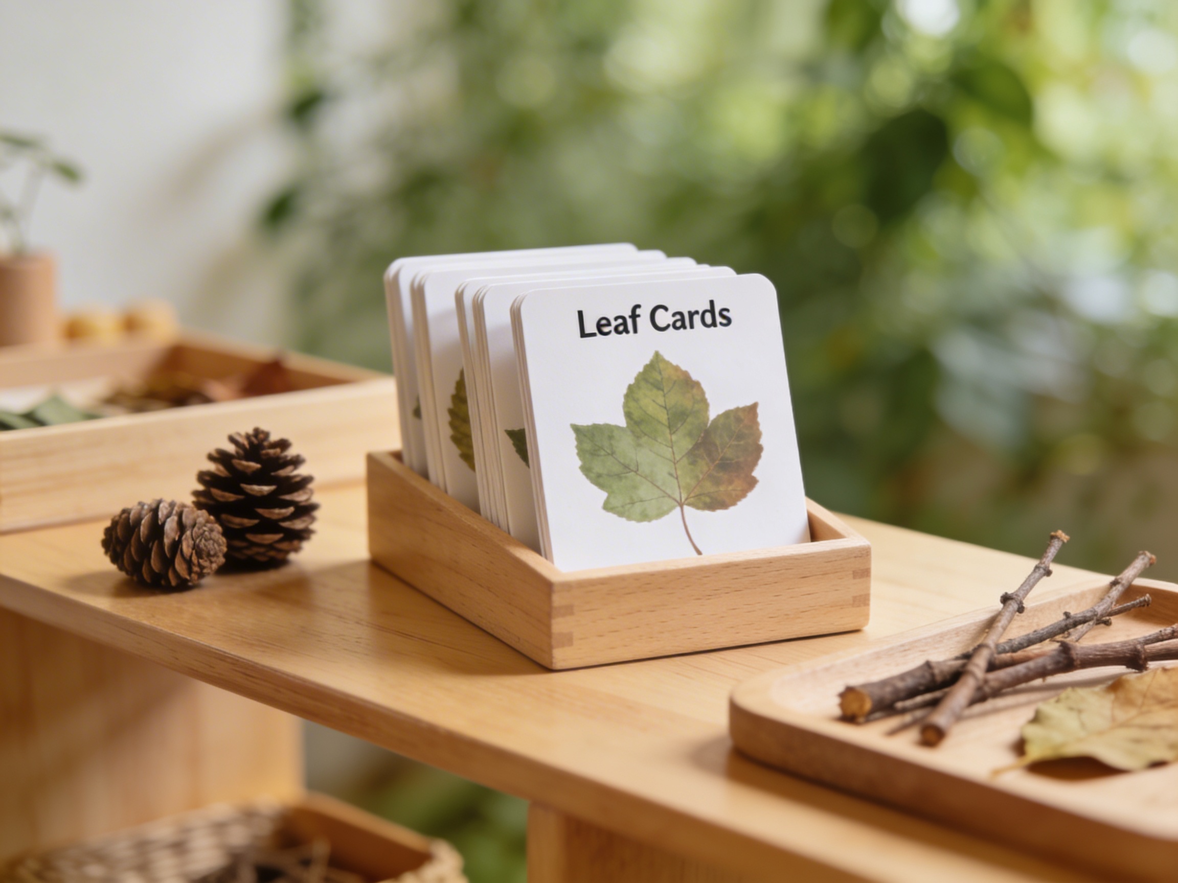 The Leaf Cards serve as a bridge between the classroom and the natural world, introducing botanical classification through precise visual matching. Each laminated card presents a distinct leaf shape—from simple ovals to complex lobed forms—inviting children to observe nature's patterns with scientific precision. The pairing of outline cards with solid green cards creates a concrete matching exercise that trains the eye to recognize botanical forms. These cards transform leaf observation from casual noticing into systematic study, preparing children for advanced botanical work. The laminated surface allows repeated handling as children sort oak from maple, simple from compound leaves. Through matching these botanical forms, children develop the visual discrimination essential for all scientific classification. The Leaf Cards cultivate what Montessori called the 'classificatory mind'—the human tendency to organize and categorize the natural world through careful observation.