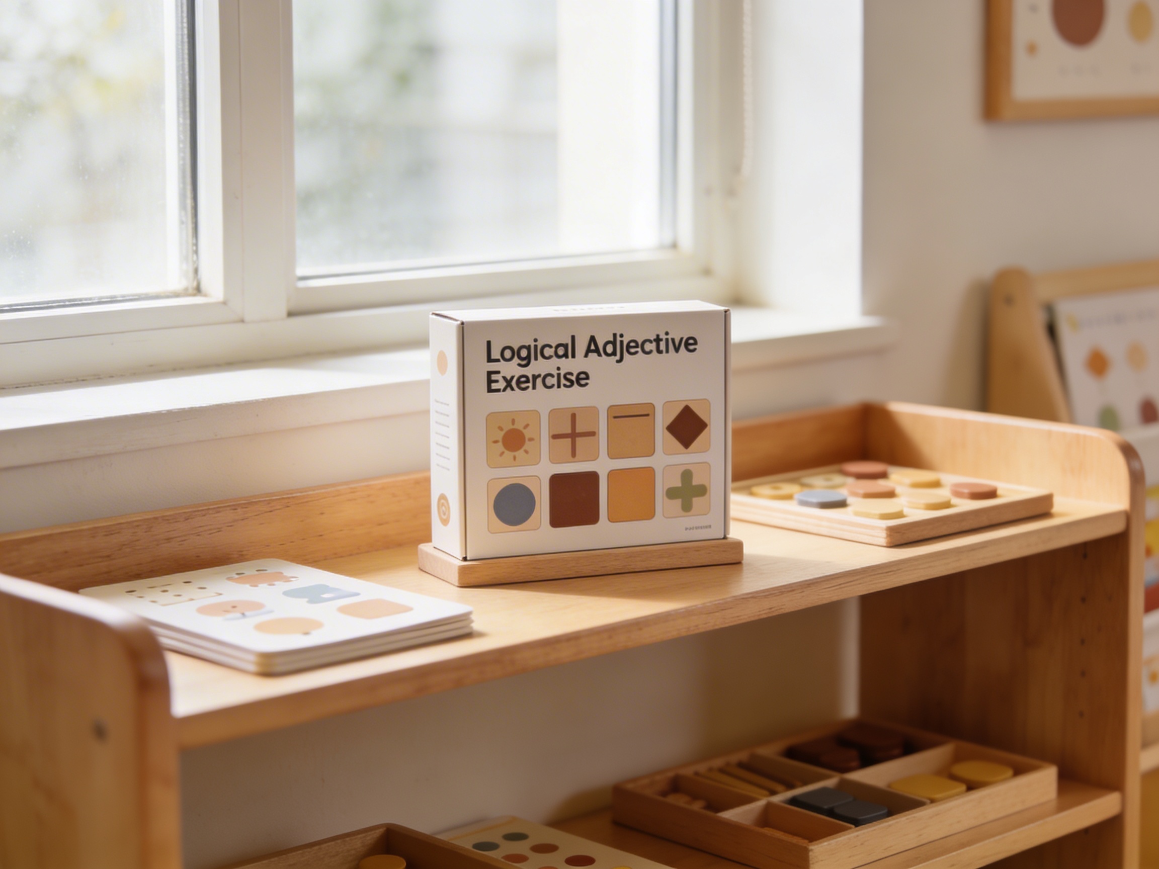 The Logical Adjective Exercise introduces grammatical concepts through color-coded word cards that children manipulate in transparent acrylic stands. These clear holders allow children to physically arrange adjectives into logical categories, transforming abstract grammar into concrete manipulation. The color-coding system of the word cards creates visual patterns that help children recognize adjective types before formal grammar instruction begins. By sorting adjectives into the acrylic displays, children discover grammatical relationships through their own exploration rather than memorization. This material bridges sensorial experiences with language learning, as children must read each adjective card and determine its logical placement within the transparent stands. The systematic organization possible with multiple acrylic holders mirrors the logical structure of language itself, preparing children for advanced reading comprehension and precise written expression.