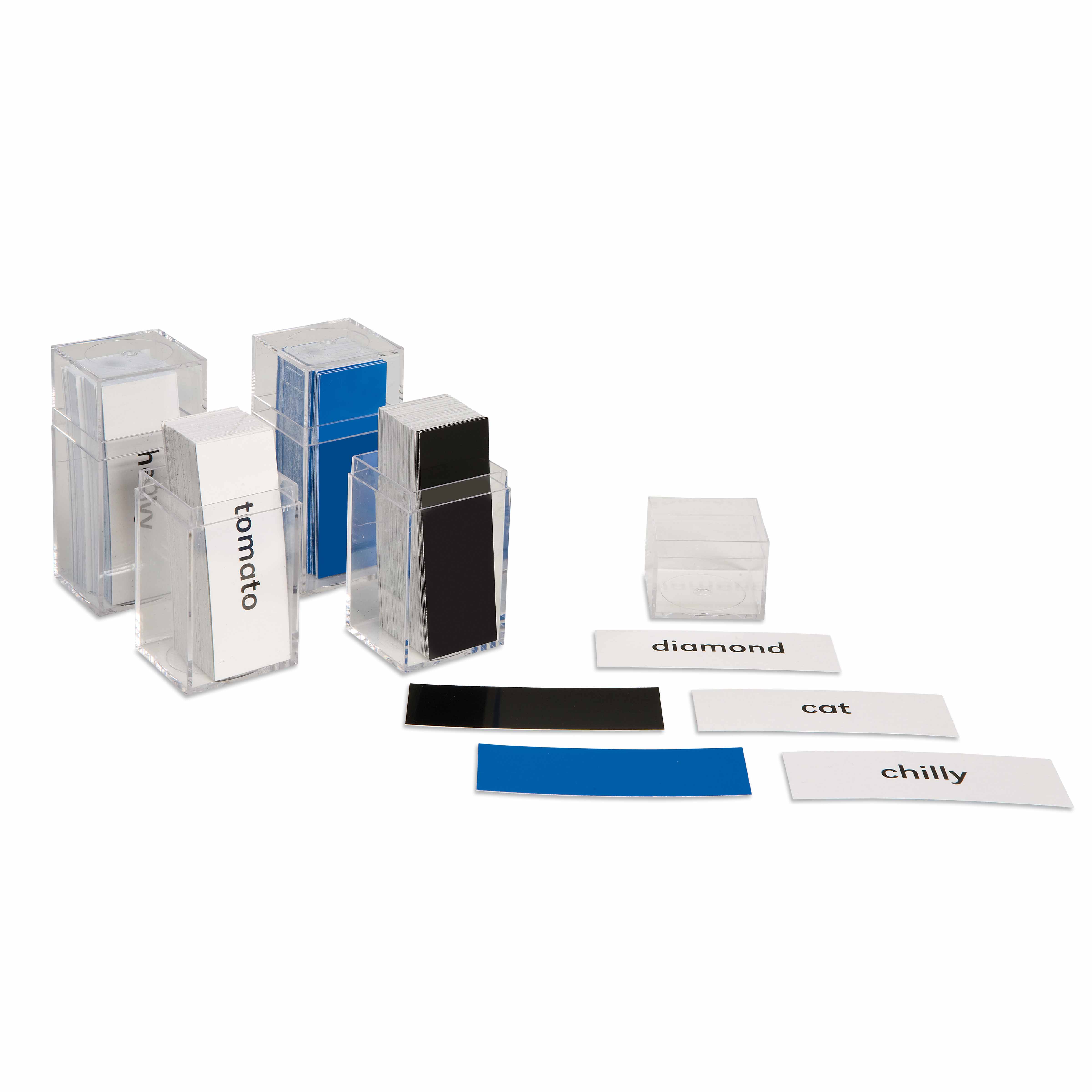 The clear acrylic holders allow children to see all cards clearly while keeping them organized by category. This transparency supports visual learning and enables children to make connections between different types of adjectives while maintaining an orderly work space.