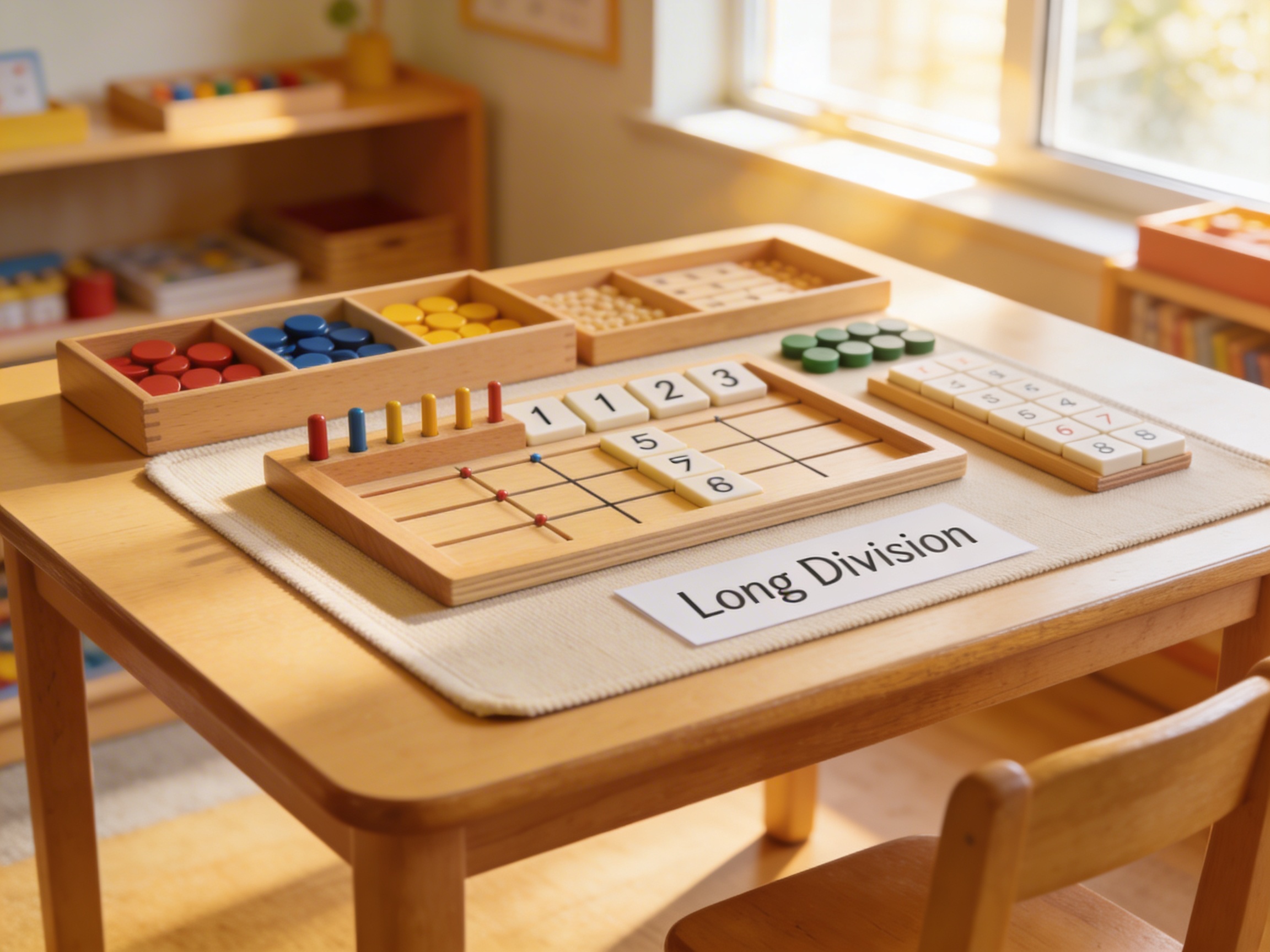 This material introduces division concepts concretely through bead manipulation, not abstract long division algorithms. Children start with simple sharing activities and progress gradually. The hands-on nature makes basic division accessible to young learners when presented appropriately.