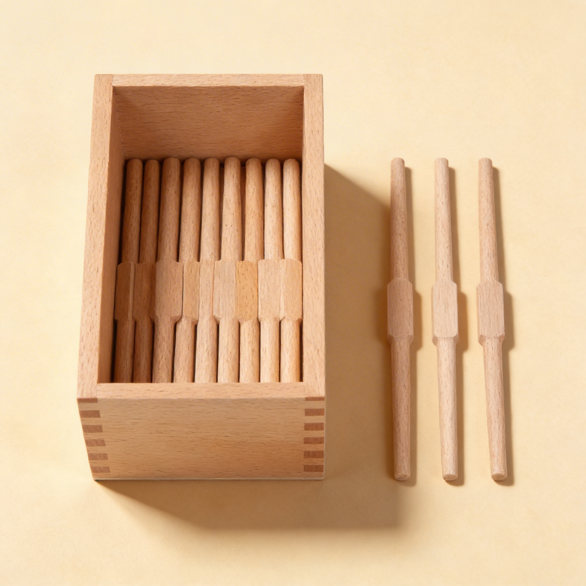 This beautifully crafted wooden spindle box features precision dovetail joints and contains smooth, tapered spindles for essential sensorial exploration. The natural beech wood construction with interior divider supports children in developing tactile discrimination, fine motor control, and mathematical concepts through hands-on manipulation of the individual spindles.