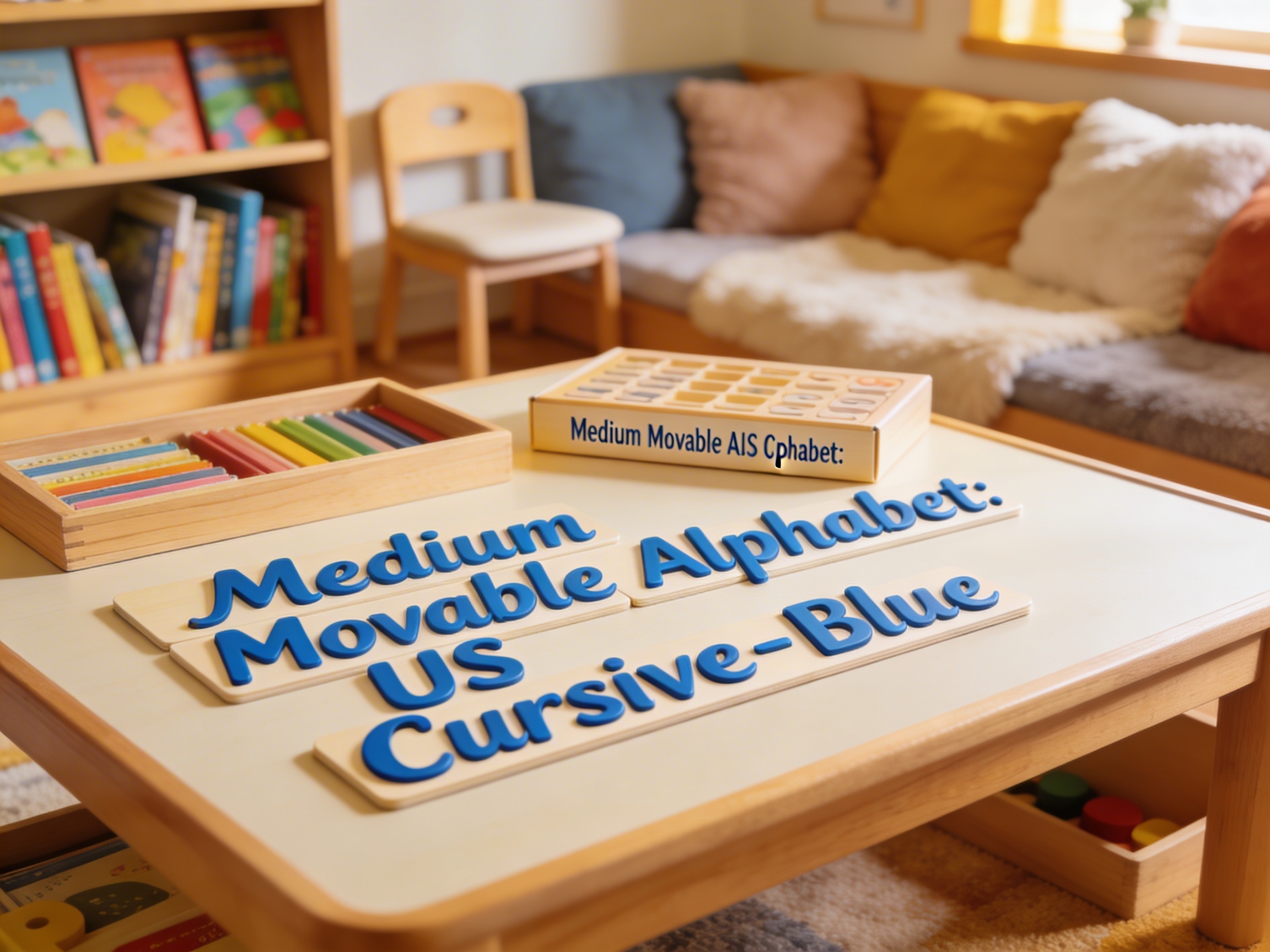 The Medium Movable Alphabet with US cursive letters addresses the child's need to express thoughts through written language before their hand has developed the fine motor control for pencil writing. Each blue cursive letter can be physically manipulated, allowing children to build words by moving letters rather than forming them with a pencil. This separation of word composition from the mechanical act of writing respects the child's intellectual readiness for language work while honoring their physical development timeline. The uniform blue color of every letter removes visual distractions, focusing attention purely on sound-symbol relationships and word construction. Through arranging these cursive letters on a mat, children experience the flow and connection points of cursive script kinesthetically, preparing their muscle memory for eventual written work. The medium size of these movable letters provides the optimal balance between visibility and manageability for small hands exploring phonetic patterns.