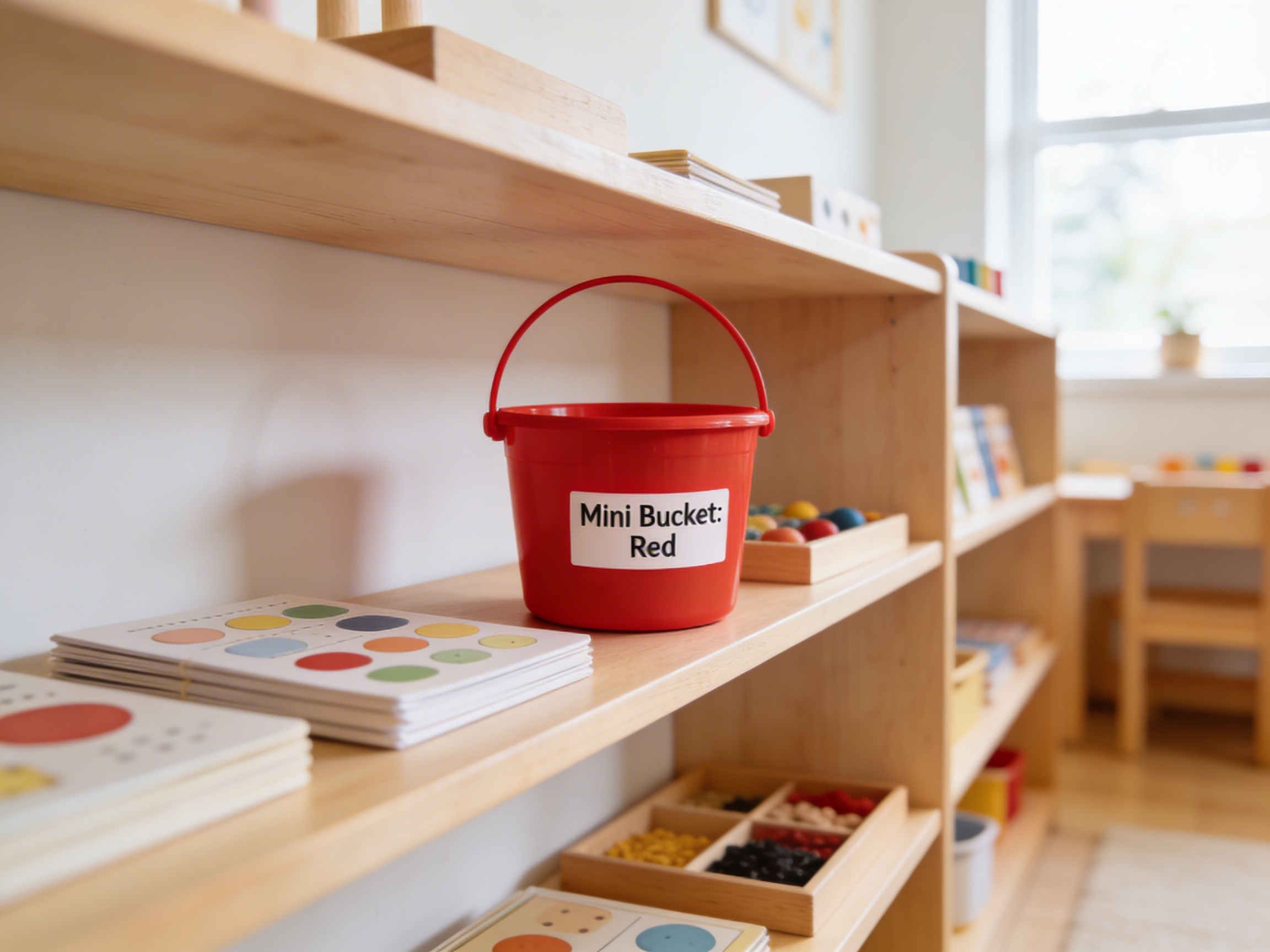 The Mini Bucket: Red is a Educational Materials Montessori material designed for children aged 0-3, crafted by Nienhuis Montessori to AMI standards.