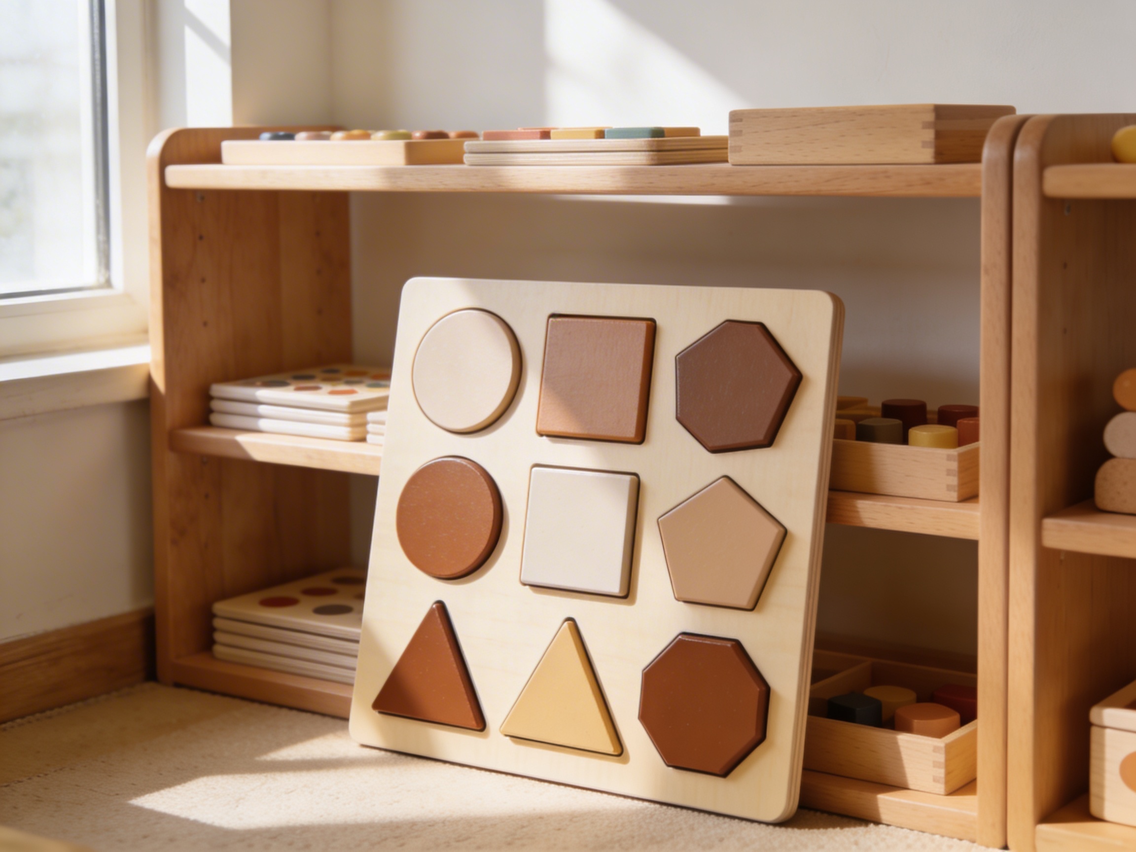 The Multiple Shape Puzzle Set is a Educational Materials Montessori material designed for children aged 0-3, crafted by Nienhuis Montessori to AMI standards.